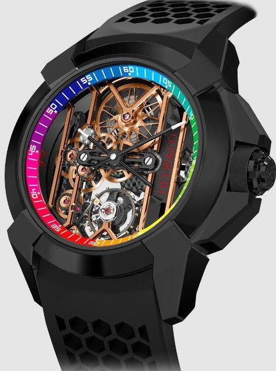 TECHNICAL SPECIFICATIONS Movement: Caliber: Exclusive Manually Wound Skeleton Jacob&Co JCAM45 Caliber; Barrel and Balance Wheel Vertically Aligned; Diameter: 14.25mm; Height: 5.90mm; Components: 158; Functions: Hours, Minutes; Power Reserve: 48-Hours; Frequenc y: 28'800 vib/h (4 Hz); Jewels: 21; System: Barrel with Sliding Clamp System; Balance Screws Visible on the Front Side; Time Setting Spring with Three Functions (“octopus spring”): Ratchet, Lever and Setting Lever; Anti-shock. Case: Diameter: 44mm; Thickness: 13.0 5 mm; Material: Black DLC Steel; custom PM logo in the inner case; Inner ring: Rainbow Neoralithe; Crystal: Sapphire with Anti-refle ctive Treatment; Case Back: Sapphire Glass; custom “Producer Michael” signature on crystal; Water resistance: 50m Dial & Hands: Red “Jacob&Co” logo on right side bridge; Drumstick hands Strap & Clasp: Honeycomb Rubber strap; Black DLC Steel Ardillon Bu ckle Warranty: 2 Years Limited Edition: 101 pieces