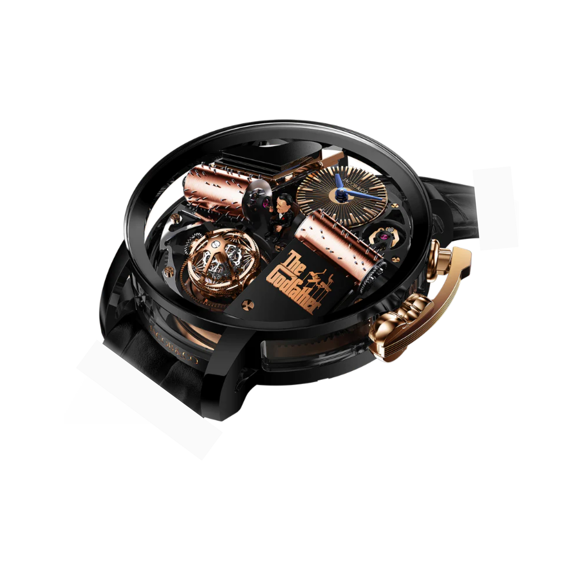 Jacob & Co. has established a partnership with Paramount Pictures and obtained the rights to The Godfather. This collaboration grants Jacob & Co. access to the name, imagery, narrative, and music of the renowned film, inspiring the creation of the ultimate movie tribute timepiece. This particular piece has a Black DLC titianium case.