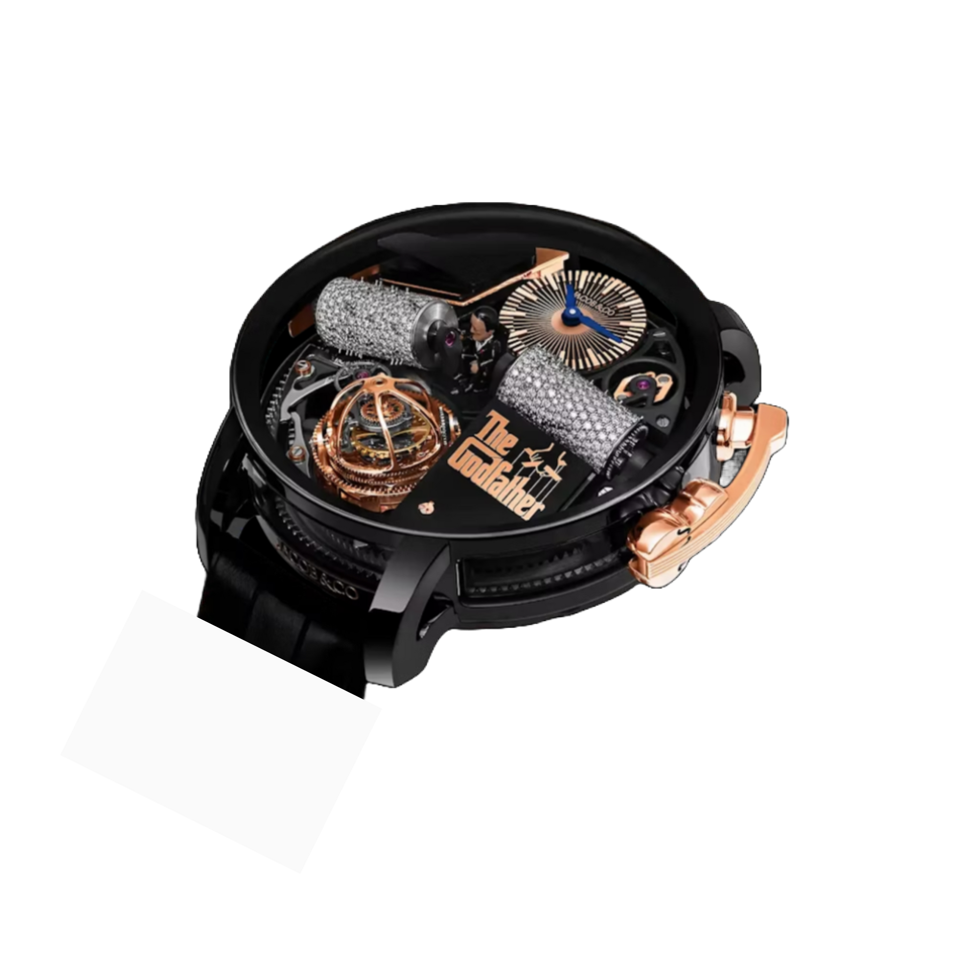 Jacob & Co. has formed a partnership with Paramount Pictures and acquired the rights to The Godfather. This collaboration provides Jacob & Co. with access to the name, imagery, narrative, and music of the acclaimed film, fueling the creation of the ultimate movie tribute timepiece. This particular piece has a Black DLC titianium case cylinders set with 666 brilliant dials.