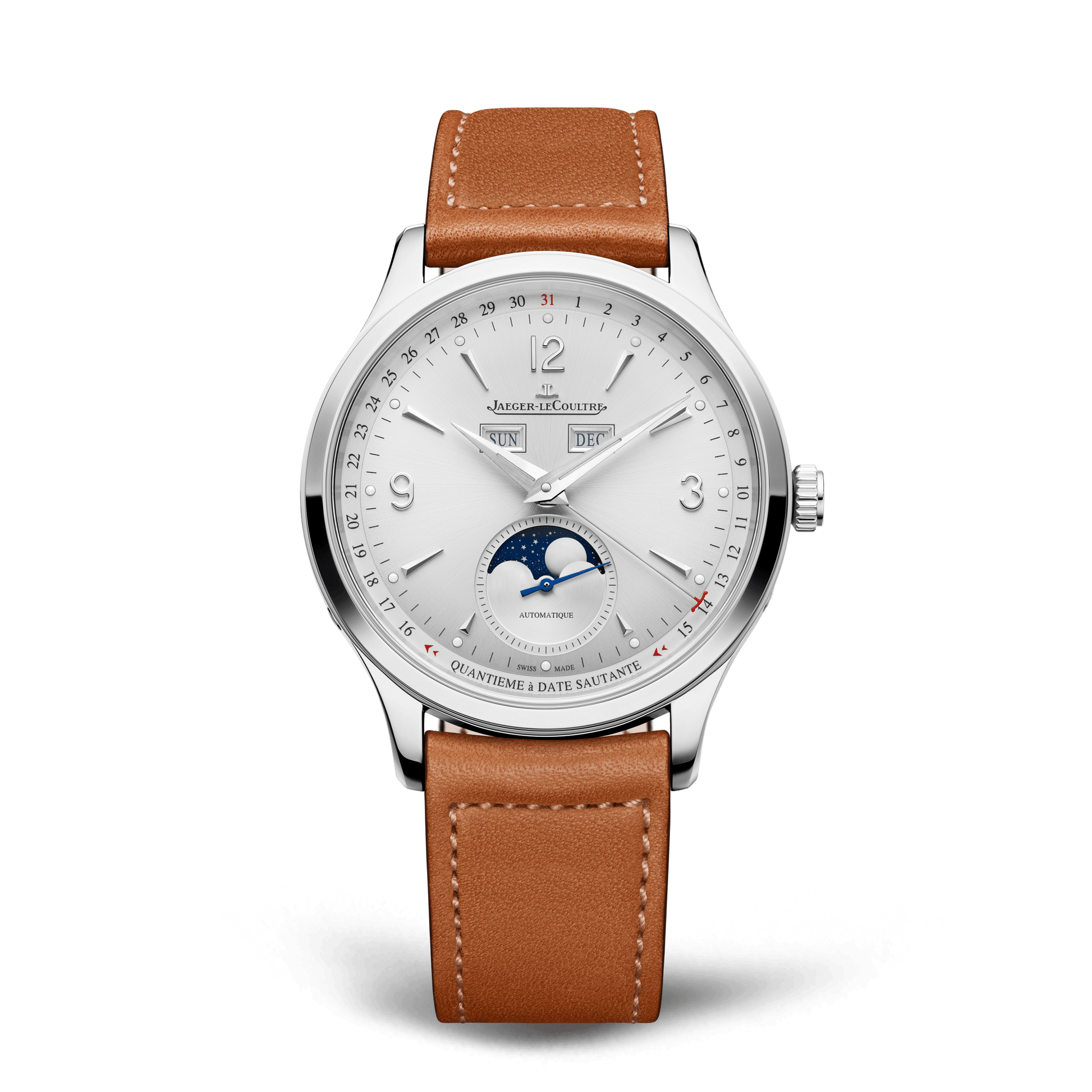 With the new Master Control Calendar, the moon phase offers a horological complication, a jumping date, which flies between the 15th and 16th day of the month. New to the Master Control collection, this mechanism ensures you never lose sight of the moon phase, located in an aperture at 6 o'clock. In its stainless steel version perfectly matched with its sunrayed silver dial, the Master Control Calendar offers a complete calendar. Under a sapphire crystal case-back, the reverse of the watch reveals the components of its new generation caliber, which promises a 70-hour power reserve.
