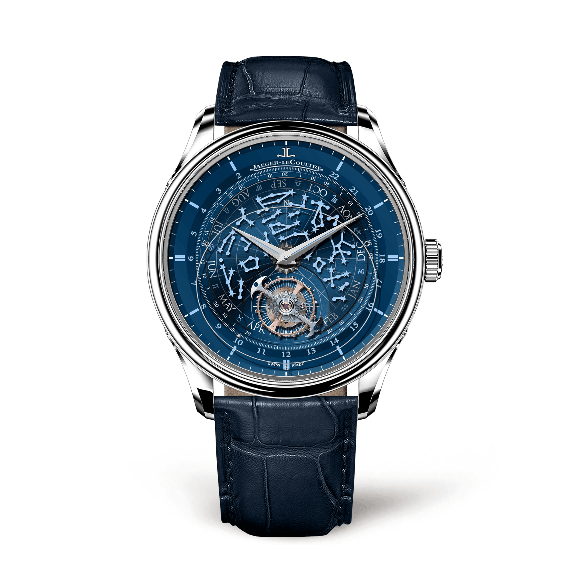 Elegant, refined and highly captivating, the Master Grande Tradition Tourbillon Céleste timepiece boasts a gradient blue dial and an orbital tourbillon performing a complete revolution around it. A Super-LumiNova® treatment is applied on the hour markers and constellations, evoking the glow of heavenly bodies on a clear night. The white gold contemporary case, part of the new generation of case design demonstrates the expertise of the Jaeger-LeCoultre Manufacture.