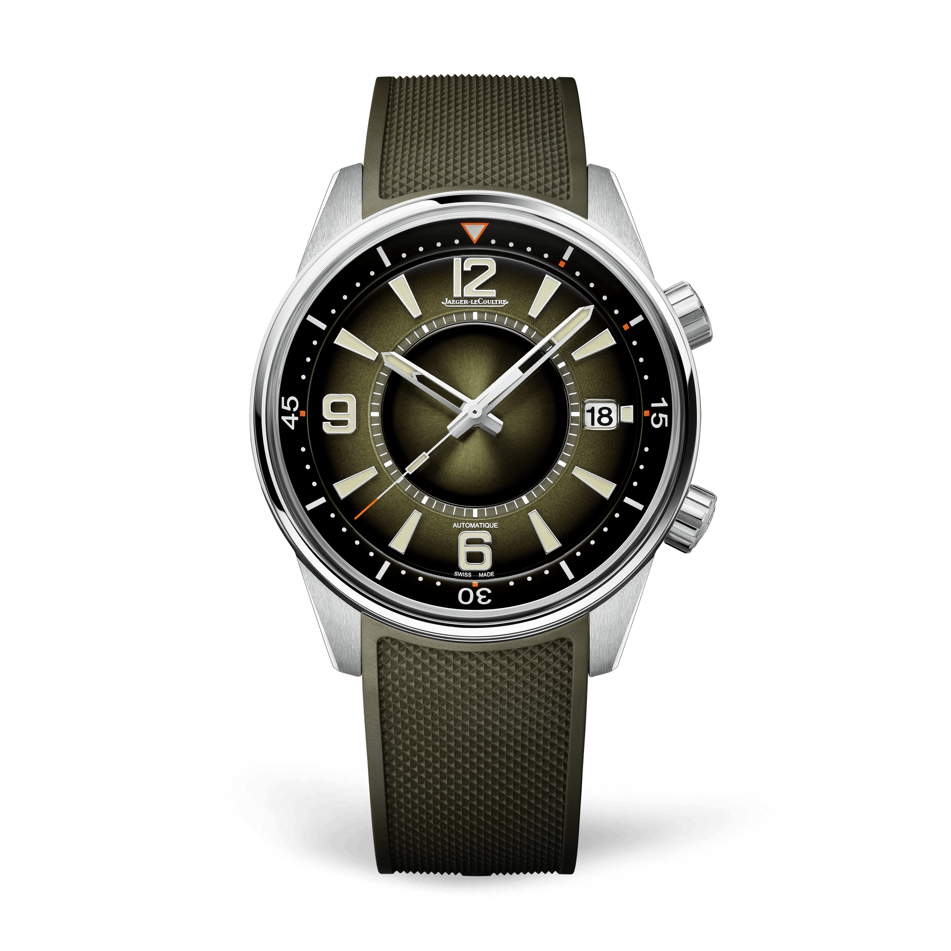 For the first time, the lacquered face of the Polaris Date watch sports a green that is as deep as it is subtle. Depending on the play of light, the color evolves and transforms from a contrasting dark green to a soft, luminous hue. With its innovative décor, the Super-LumiNova® hour markers and numerals stand out in all their brilliance alongside the skeletonized hands with luminescent tips. Paying homage to the first Memovox Polaris, the vanilla tone of their finish further enhances their striking visual appeal. The sharp lined, 42-mm stainless steel case boasts a double-polished satin finish and is complemented by an easily interchangeable green rubber strap with a Clous de Paris motif. The sapphire crystal case back reveals the finishes of the new generation Jaeger-LeCoultre Calibre 899. Designed, produced and assembled under the same roof, this Manufacture movement offers a 70-hour power reserve, a highly practical feature for a sports watch.