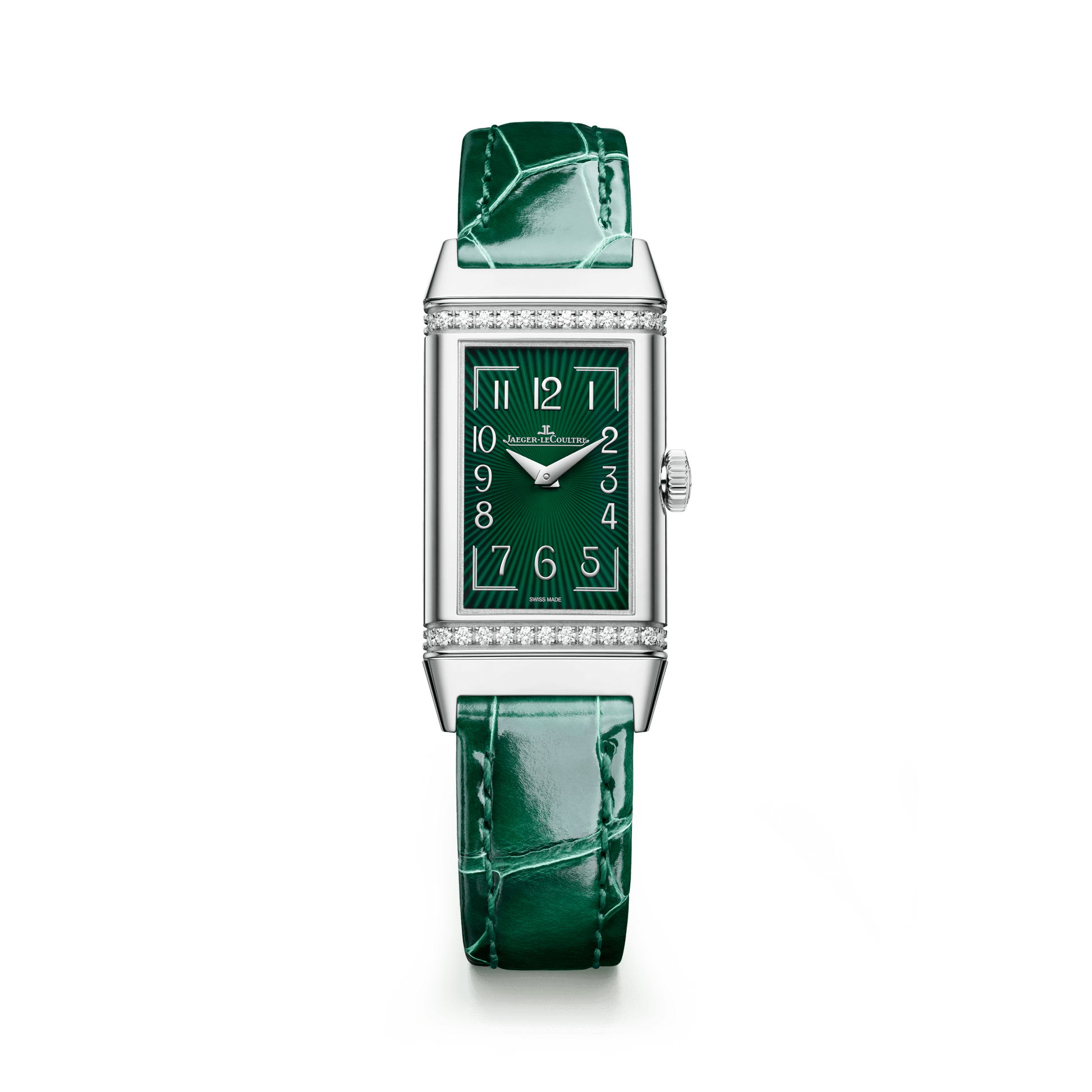 Distinguished by the strength and purity of lines derived from its original Art Deco design, the new Reverso One introduces a remarkable green colour adding refinement to the collection. Inspired by the first elongated models that were so popular in the 1930s, this new feminine and captivating expression of the Reverso One reveals a modern elegance. With its rectangular case, iconic gadroons, elegant Arabic numerals, Dauphine hands, and two rows of brilliant-cut diamonds surrounding its lacquered dial, it reinterprets the codes of this iconic collection in an inimitable signature Jaeger-LeCoultre Art Deco style.