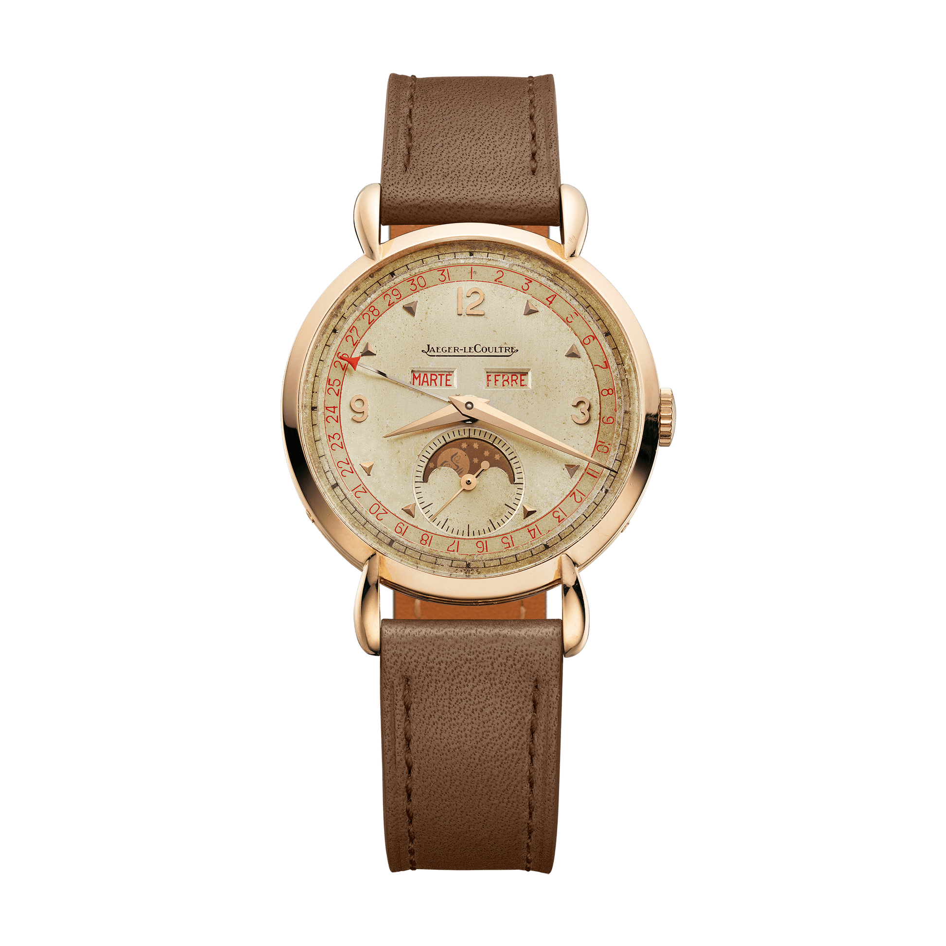 Equipped with the manual-winding Jaeger-LeCoultre Calibre 494 with calendar and moon phase indications, the watch is fitted on a new dark brown leather strap.