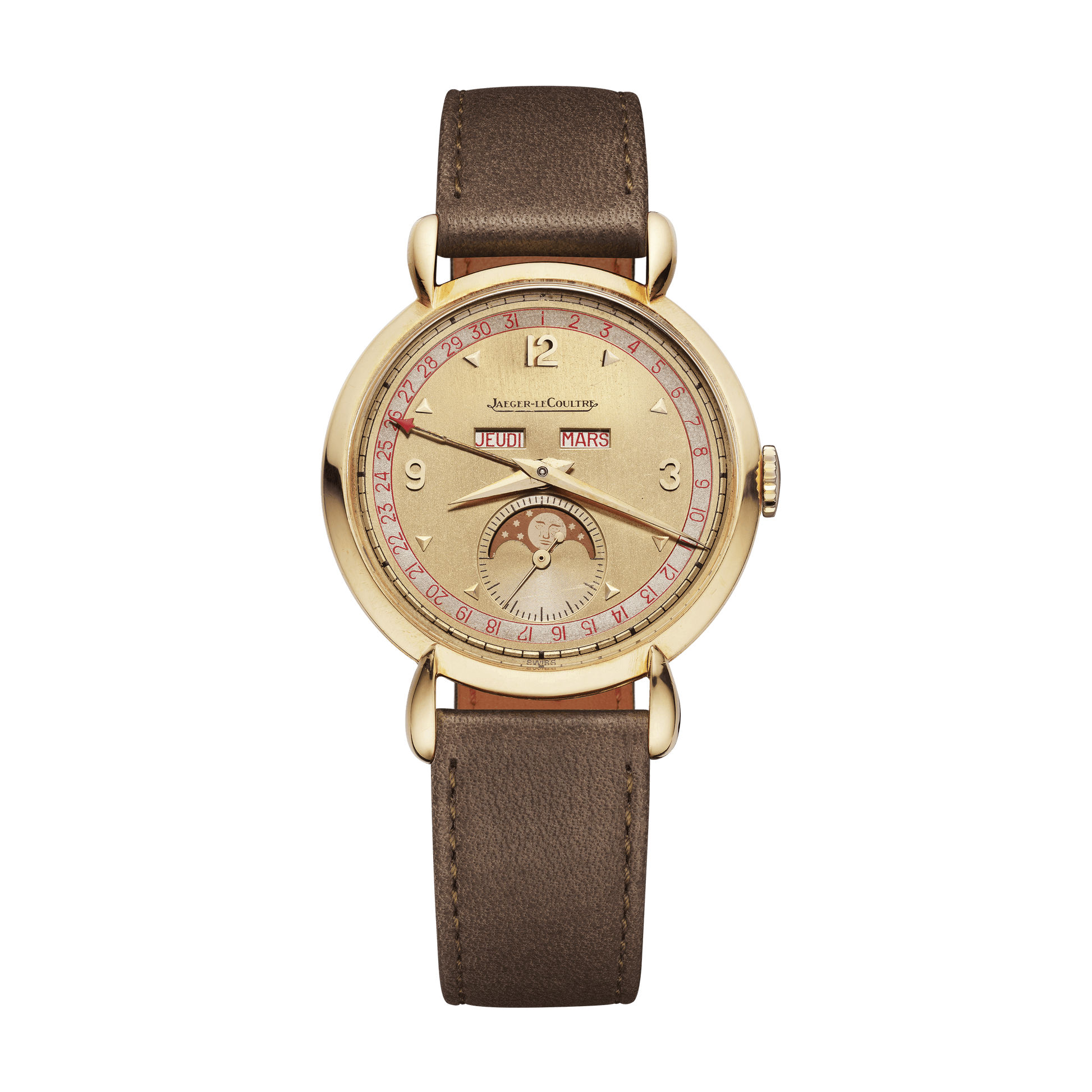 Equipped with the manual winding Jaeger-LeCoultre Calibre 494 , it displays a complete calendar, as well as the moon phases, and sports a new brown strap.