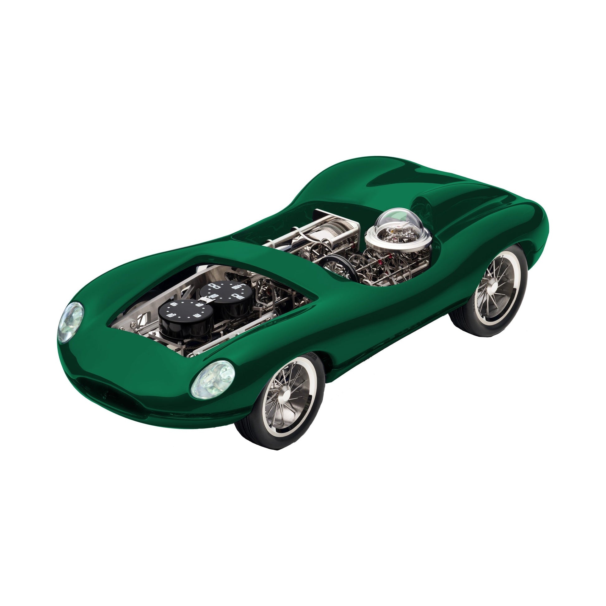 Time Fast II features two independent movements, both with their own power source. The first movement is in the cockpit and is responsible for keeping the time. Hours and minutes are displayed by rotating stainless steel disks on the air filters feeding the dual carburetor banks on top of the engine. The 8-day movement is regulated by a visible 2.5 Hertz escapement in the ‘driver’s helmet’ and powered by a mainspring visible in the passenger’s seat.