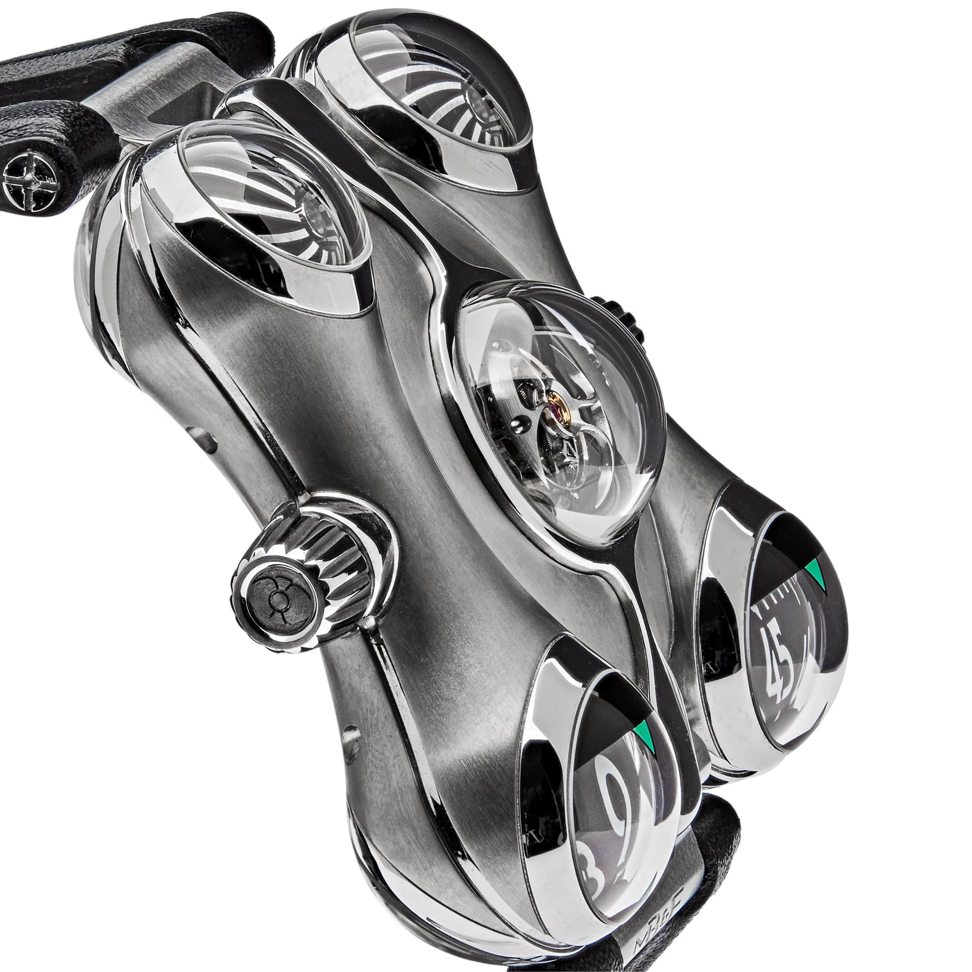 The MB&F HM6 “Space Pirate” is a sculptural beast crafted in Grade-5 titanium, and restricted to just 50 pieces. Its biomorphic 49.5 × 52.3 × 20.4 mm case features four sapphire domes—two at the front housing rotating aluminum semi-spheres for hours and minutes, and two at the rear revealing twin turbines that regulate winding efficiency. A central dome holds a flying tourbillon protected by a retractable shield that opens and closes like an eye, offering both drama and technical purpose.