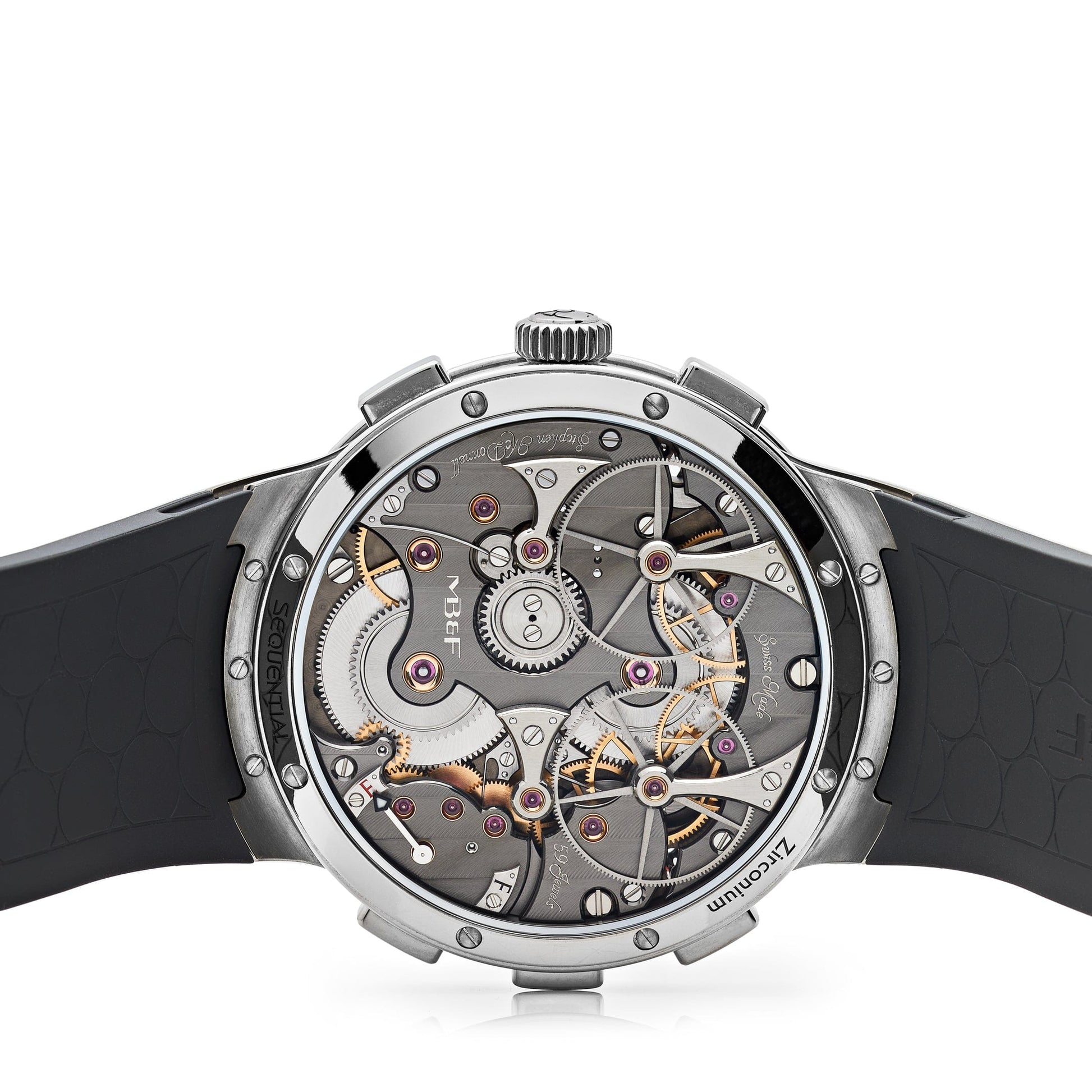 The MB&F Legacy Machine Sequential EVO 09.ZR.OR is engineered with sophistication and precision. Featuring a zirconium case with a diameter of 44mm and height of 18.2mm, this timepiece is packed with 74 components and has an impressive water resistance of 80m. Its fully integrated dual chronograph system allows multiple timing modes and is powered by a manual winding with a double mainspring and a flying balance wheel. It offers a time display at 6 o’clock, left and right chronographs, and a power reserve of 72 hours with 585 components and 59 jewels. The watch comes on a black rubber bracelet.