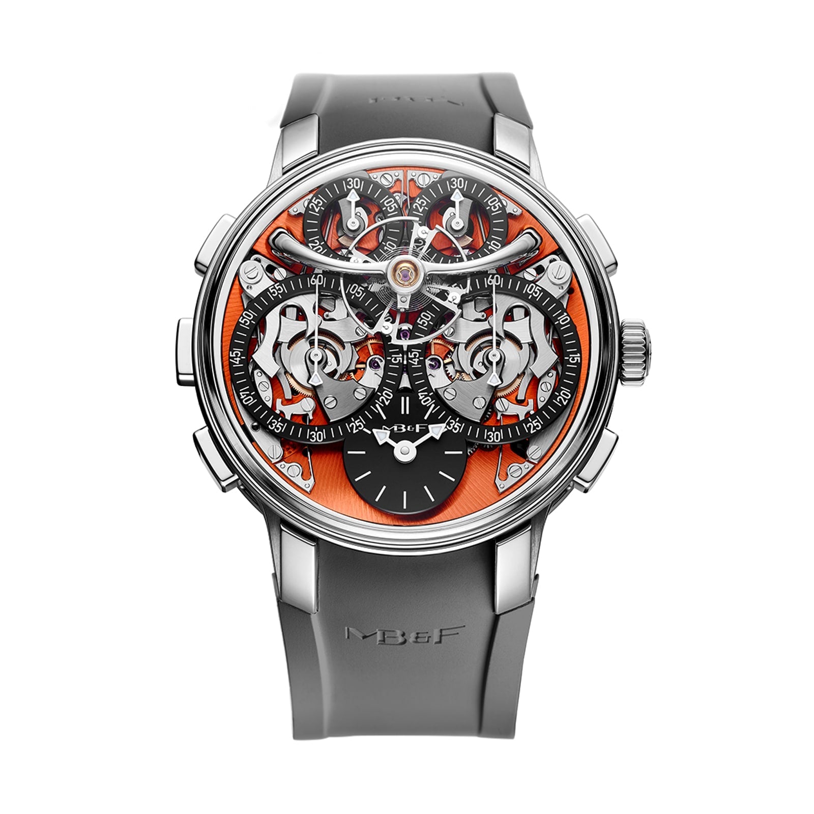 Designed by pioneering MB&F collaborator Stephen McDonnell, the LM Sequential EVO revolutionizes chronograph capabilities beyond conventional boundaries. Like the groundbreaking Legacy Machine Perpetual of 2015, this timepiece completely reimagines fundamental chronograph design principles. The striking dial, available in vibrant atomic orange or sophisticated coal black, showcases dual chronograph displays that operate with unprecedented independence. Each display can be individually controlled through dedicated start/stop and reset pushers positioned on opposite sides of the case, delivering unmatched versatility and precision for the discerning watch enthusiast.