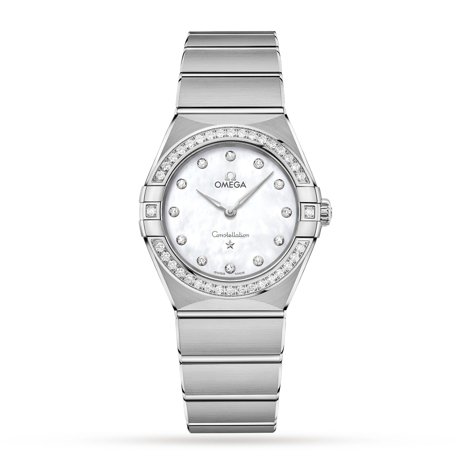 The dramatic and enduring design of the OMEGA Constellation is characterised by its famous half-moons, “claws” on the case and mono- rang bracelet. This 28 mm stainless steel model features a diamond-paved bezel, white mother-of-pearl dial with diamond hour markers and scratch-resistant sapphire crystal. The hands, OMEGA logo, Constellation star and diamond holders are in 18K white gold. At the heart of this timepiece is the OMEGA Calibre 4061, while the caseback is stamped with the Constellation Observatory medallion.