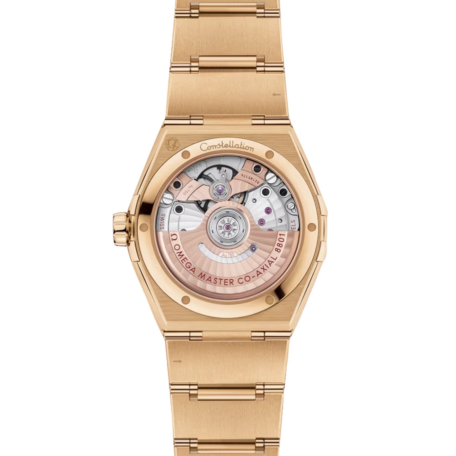 The dramatic and enduring design of the OMEGA Constellation is characterised by its famous half-moons, “claws” on the case and mono- rang bracelet. This 36 mm 18K yellow gold model features a bezel engraved with Roman numerals, a sun-brushed champagne dial and a date window at the 6 o'clock position. The hands, OMEGA logo, Constellation star and indexes are all in 18K yellow gold. At the heart of this timepiece is the OMEGA Co-Axial Master Chronometer Calibre 8801, visible through the domed scratch-resistant sapphire crystal.