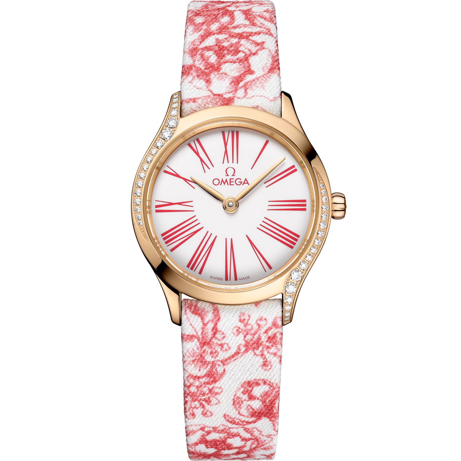 This watch is set on a unique Toile de Jouy fabric bracelet with a red floral design. Inside, the timepiece is driven by the OMEGA Calibre 4061, which sits behind a metallised sapphire crystal caseback with a mirror effect and “Her Time” pattern.