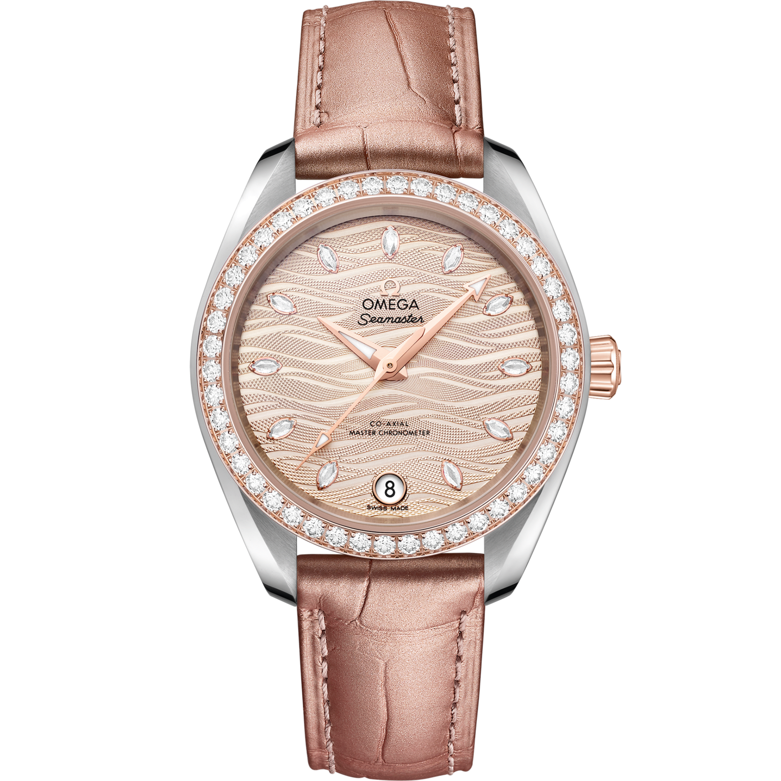 OMEGA's beautiful 34 mm Seamaster has a symmetrical case in stainless steel and 18K Sedna™ gold and a polished diamond-set bezel. The nude wave-embossed dial has central hour/minute and seconds hands in diamond-polished 18K Sedna™ gold, a date window at 6 o’clock and 11 marquise-cut diamond hour markers.