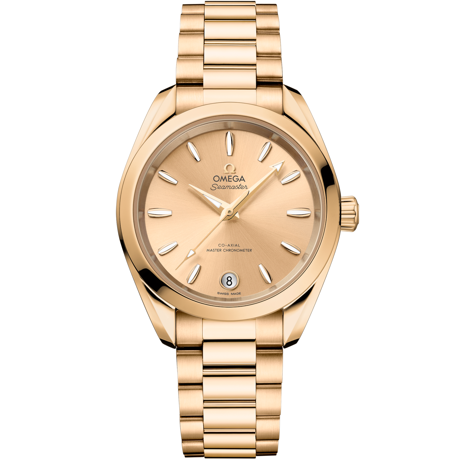 The Seamaster Aqua Terra is a superb tribute to OMEGA’s rich maritime heritage. This 34 mm model has a symmetrical 18K Moonshine™ Gold case with a screw-in caseback featuring a wave-edged design.