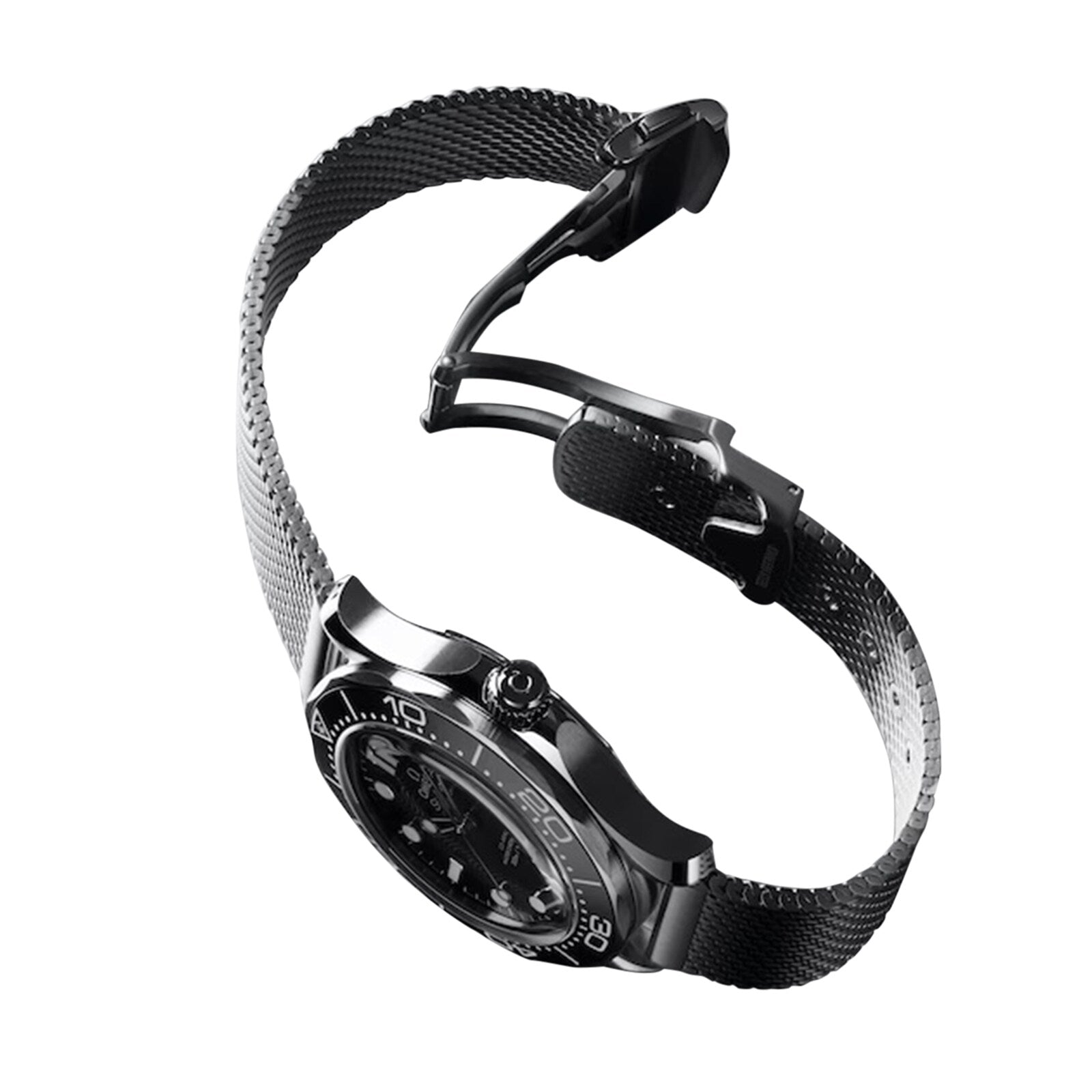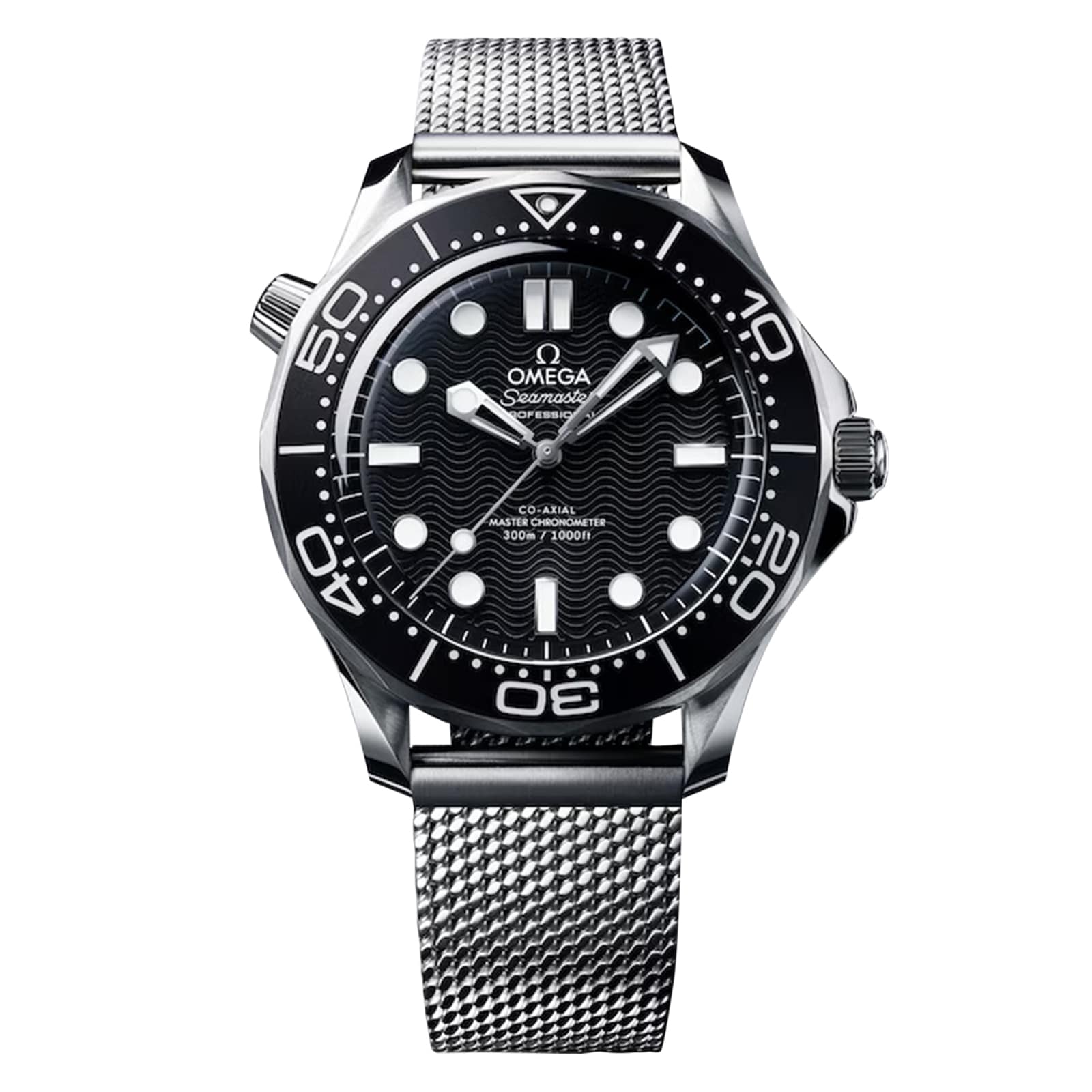 Since 1993, the Seamaster Diver 300M has enjoyed a legendary following. Today’s modern collection has embraced that famous ocean heritage and updated it with OMEGA’s most advanced innovation and design. This 42 mm model is crafted in stainless steel and includes a black oxalic anodized aluminium bezel ring with a diving scale in white Super-LumiNova. Black aluminium is also used to create the dial, which is laser-engraved with the Diver’s iconic wave pattern. The skeletonized hands and indexes are rhodium plated and filled with white Super-LumiNova, while the other markings, including the OMEGA logo, are transferred in white. The watch is presented on a brushed mesh bracelet with clasp, and is driven by the OMEGA Co-Axial Master Chronometer Calibre 8806, which can be seen through the sapphire-crystal caseback.