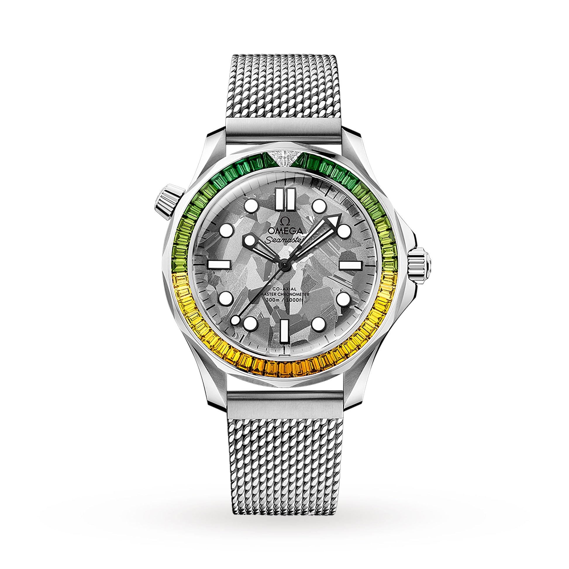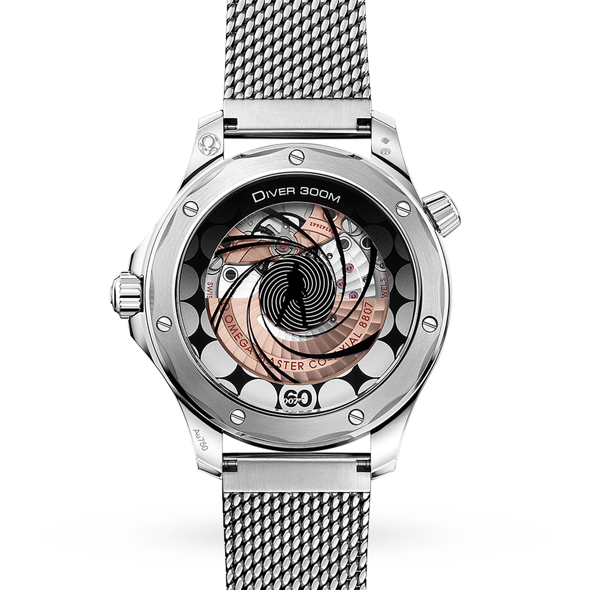 James Bond 007 60th Anniversary piece Powered by Omega Master Co-Axial 8807 calibre movement Presented on a 42mm 18ct white gold case and bracelet Water resistant to 30 bar (300 metres) Presented in a mango tree box with mother of pearl marquetry SEAMASTER PRO DIVER 300M COLLECTION Paying tribute to Omega's ocean heritage, the Seamaster Planet Ocean collection features Master Chronometer certification, advanced designs and water resistance to 300 metres. Designed for use underwater, the Pro Diver collection includes co-axial escapement for long-lasting precision, a silicon balance spring for superior anti-magnetism, and a newly designed helium escape valve. JAMES BOND 007 60TH ANNIVERSARY This 42mm Seamaster 300 model presents an 18ct white gold case on a 18ct white gold bracelet to celebrate 60 years of James Bond. A natural grey silicon dial is framed by a unidirectional rotating bezel with a paving of shaded green and yellow treated diamonds- a nod to 007's Caribbean hideaway. On the case back, the iconic movie opening sequence, featuring Bond in silhouette and a spinning gun barrel can be admired while Omega Master Co-Axial 8807 calibre movement gets to work. This watch come complete in a mango tree box with mother of pearl marquetry, 60 years of Bond logo, and 60's inspired dots.