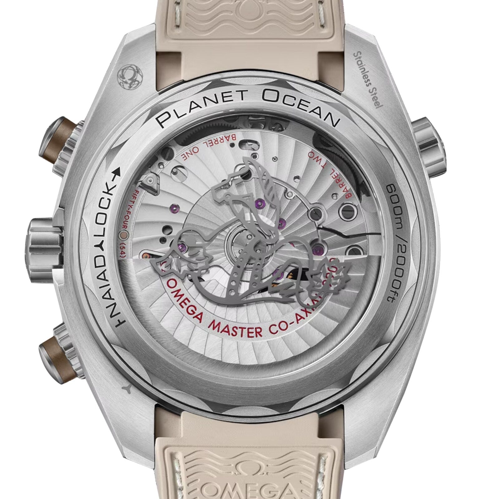 Planet Ocean - a celebration of Omega's dive watch legacy Seamaster heritage driven by the Co-Axial Master Chronometer Calibre 9900 movement Water resistant to 60 bar (600 metres) Housed in a 45.5mm brushed stainless steel case paired with an integrated beige rubber strap Sand-blasted beige varnished dial framed by a brushed silicon nitride bronze ceramic bezel ring DESIGNED FOR DIVERS Introduced in 2005, the Planet Ocean 600m collection pays tribute to the brand's ocean heritage with modern design, creative touches, and revolutionary Master Chronometer movements. Designed to meet the unique needs of divers, this updated range is equipped with Super-LumiNova coated indexes for visibility underwater, as well as water resistance to 60 bar (600 metres). UPDATED STYLE AND ADVANCED PRECISION Paying homage to the brand's dive watch heritage, this 45.5mm watch features a sand-blasted beige varnished dial with a date window at 6 o'clock, bronze silicon nitride ceramic sub-dials, and Arabic numerals, hands, and hour makers in PVD grey with a brushed finish. The classic brushed stainless steel case features pushers with bronze brushed silicon nitride ceramic rings and is paired with an integrated beige rubber strap with a structured pattern and white stitching. Power and precision are delivered by the Co-Axial Master Chronometer Calibre 9900 movement, which can be seen through the transparent, sapphire crystal case back. Super-LumiNova ensures visibility in the depths of the ocean, while a 60-hour power reserve further enhances performance.