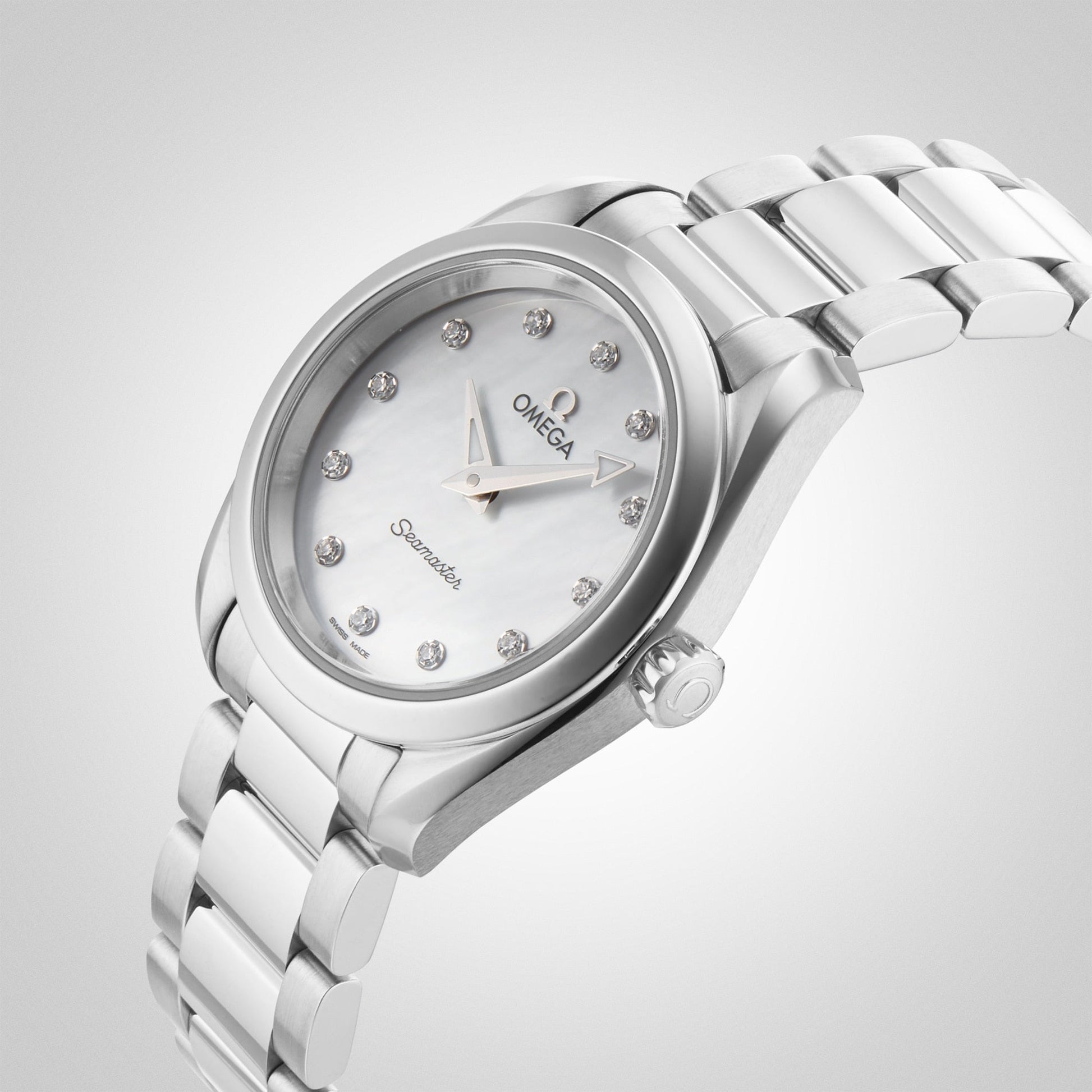 A beautiful tribute to Omega’s maritime spirit Seamaster heritage with the 4061 calibre quartz movement Water resistant to 15 bar (150 metres) 28mm stainless steel case paired with a stainless steel bracelet White mother-of-pearl dial with 12 diamond hour markers CELEBRATING OMEGA’S OCEAN SPIRIT A tribute to Omega’s rich maritime heritage, the Seamaster Aqua Terra collection balances technical sophistication and ocean spirit. The elegant, 150m models are notably stylish with captivating dials in rich shades, shimmering finishes, and glistening diamond details. REFINED ELEGANCE This 28mm watch features a slender, stainless steel case, complemented by a stainless steel bracelet. The glistening, white mother-of-pearl dial features 12 diamond hour markers, while the caseback is embossed with a seahorse - a further nod to Omega’s maritime past. Delivering flawless precision on land and at sea, the 4061 calibre movement is officially certified, and is water resistant to 15 bar (150 metres).