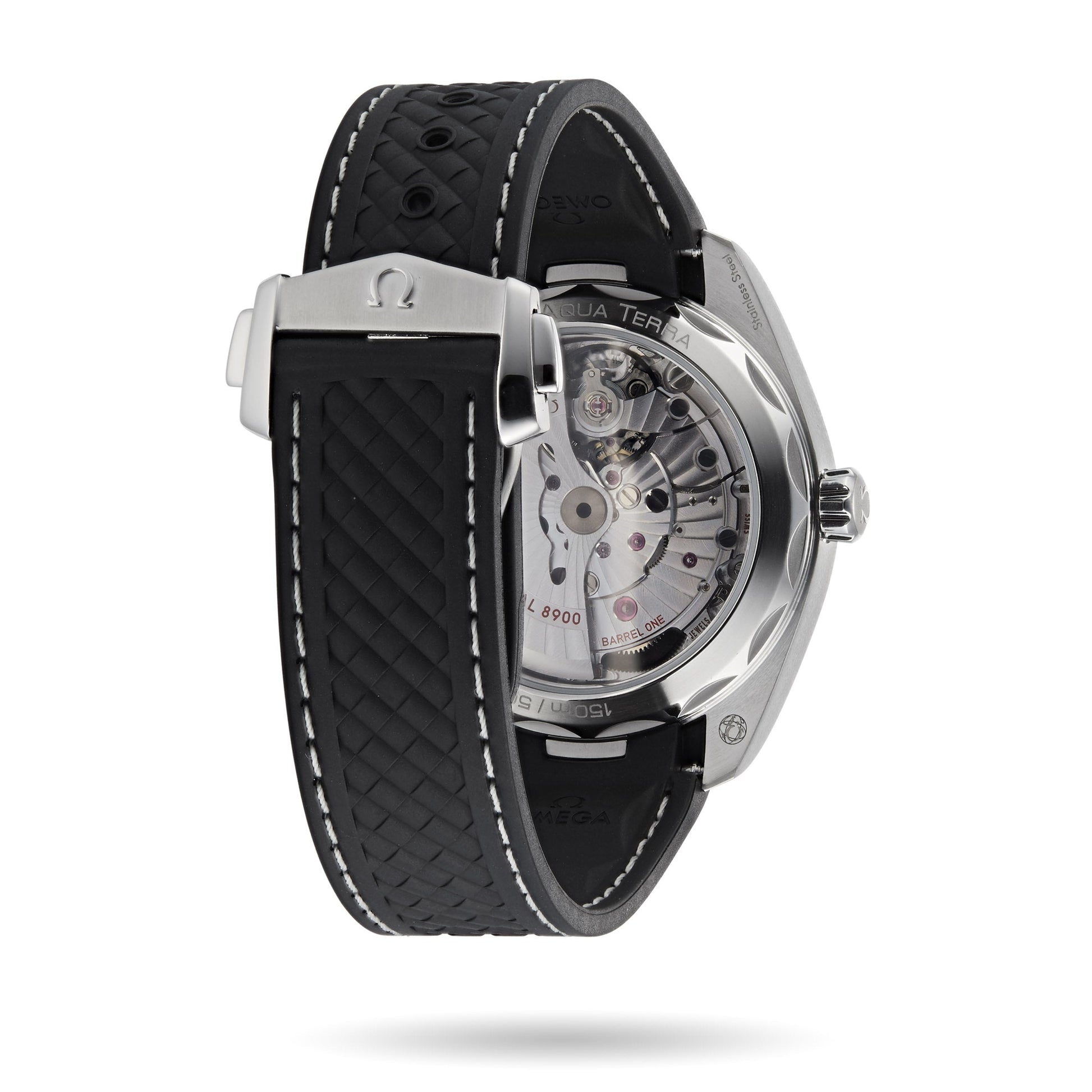 A tribute to Omega’s rich maritime legacy Seamaster heritage with the 8900 calibre movement Water resistant to 15 bar (150 metres) 41mm stainless steel case paired with a black rubber strap Master chronometer certified by METAS INSPIRED BY LUXURY SAILBOATS A tribute to Omega’s rich maritime heritage, the Seamaster Aqua Terra collection balances technical sophistication and ocean spirit. The 150m models offer a refreshing new look, with clean aesthetics, a new symmetrical case design, and Master Chronometer movements with extraordinary levels of magnetic resistance. These timepieces are further characterised by a patterned dial, inspired by the wooden decks of luxury boats. ATTENTION TO DETAIL This 41mm timepiece is presented in a symmetrical, stainless steel case, paired with a black, structured rubber stap. The black, teak pattern dial features a date window at 6 o’clock, replicating the first Omega watch with a date window, released in 1952. Power and precision are delivered by the 8900 calibre movement, with magnetic field resistance to 15,000 gauss.