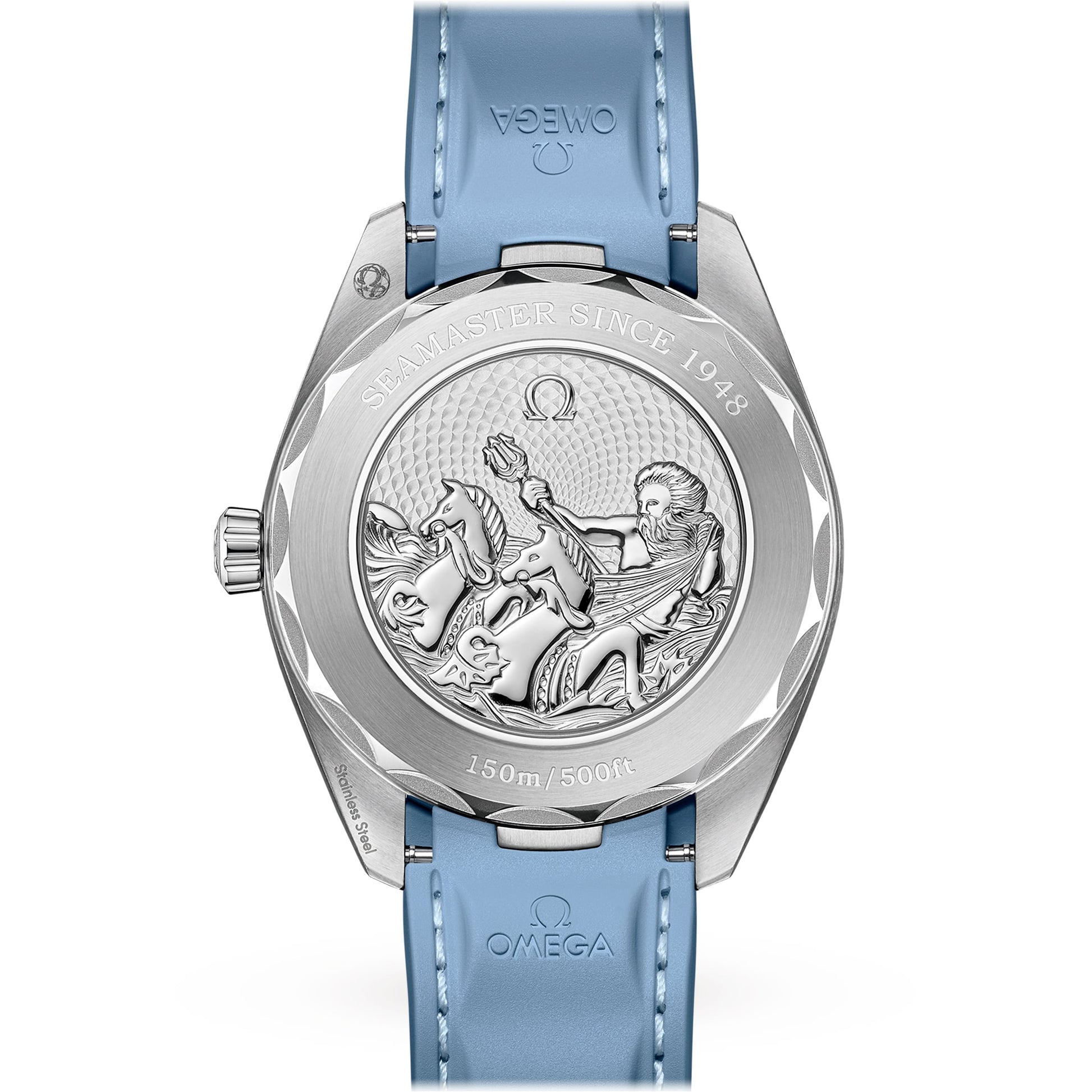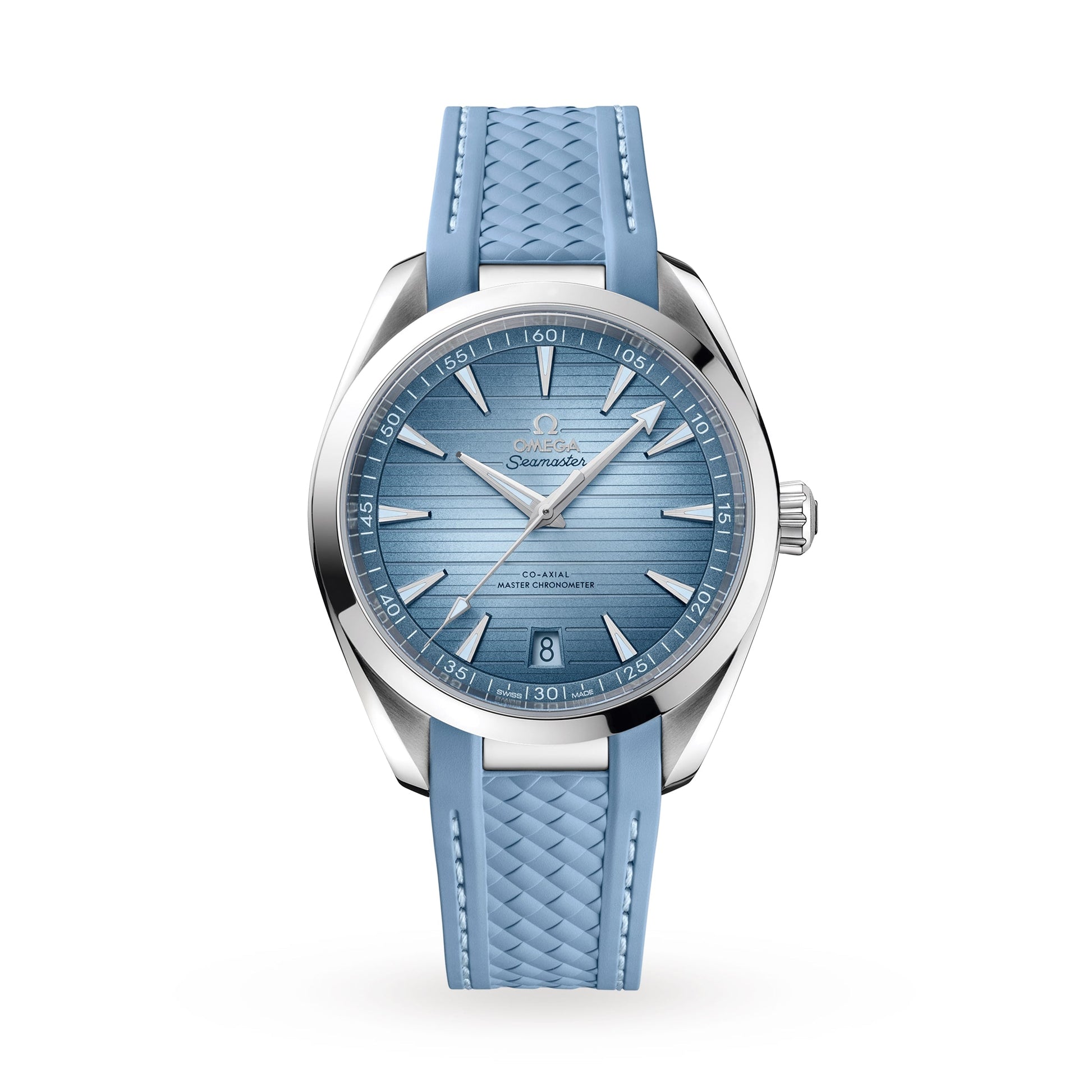 Seamaster Aqua Terra - a tribute to Omega's rich maritime legacy Teak pattern dial in Summer Blue with a gradient finish Water resistant to 15 bar (150 metres) 41mm stainless steel case paired with an integrated blue rubber strap Master chronometer certified by METAS INSPIRED BY LUXURY SAILBOATS A tribute to Omega's rich maritime heritage, the Seamaster Aqua Terra collection balances technical sophistication and ocean spirit. The 150m models offer a refreshing new look, with clean aesthetics, a new symmetrical case design, and Master Chronometer movements with extraordinary levels of magnetic resistance. These timepieces are further characterised by a teak patterned dial, inspired by the wooden decks of luxury boats. ATTENTION TO DETAIL This 41mm watch is presented in a symmetrical, stainless steel case, paired with an integrated blue rubber strap. The Summer Blue teak pattern dial is sun-brushed, PVD-treated and varnished with a gradient, and features rhodium-plated hands and indexes filled with a unique light blue Super-LumiNova, and a date window at 6 o'clock. Power and precision are delivered by the Co-Axial Master Chronometer 8900 calibre movement, certified at the highest level by the Swiss Federal Institute of Metrology (METAS).