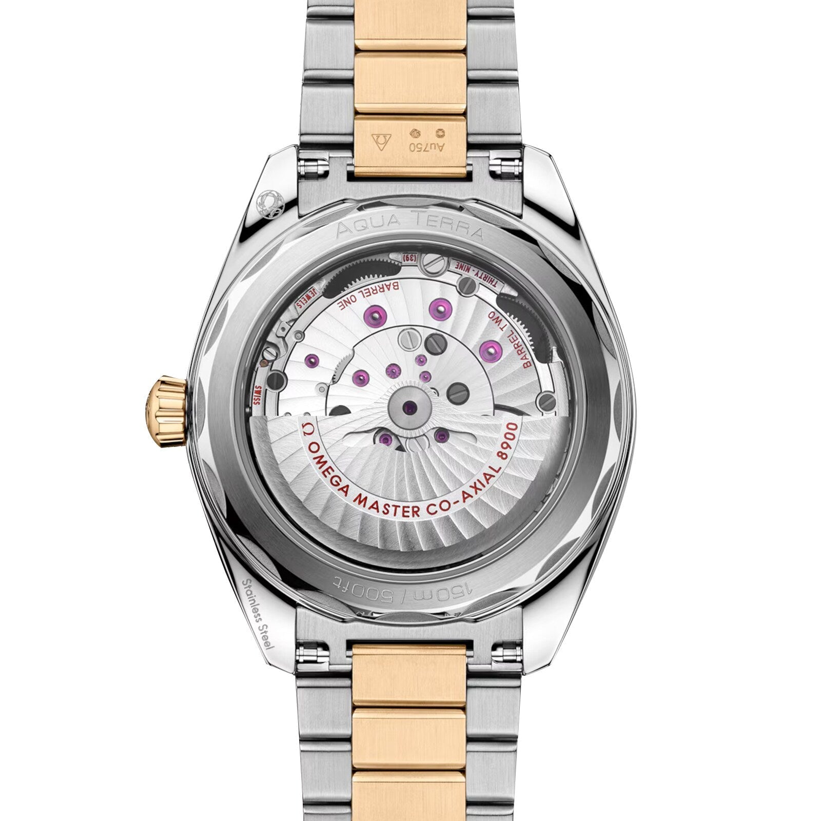 The Seamaster Aqua Terra is a superb tribute to OMEGA’s rich maritime heritage. This 41 mm model has a symmetrical stainless-steel and 18K Moonshine™ Gold case with a screw-in caseback featuring a wave-edged design. It has a lacquered black varnish dial with 18K Moonshine™ Gold OMEGA logo, and date window at 6 o'clock. The hands and hour markers, also in 18K Moonshine™ Gold, are filled with white Super-LumiNova which emits a blue glow. The watch is presented on an integrated bracelet with polished central links and brushed external links and powered by OMEGA’s Co-Axial Master Chronometer calibre 8900, certified at the industry’s highest standard by the Swiss Federal Institute of Metrology (METAS).