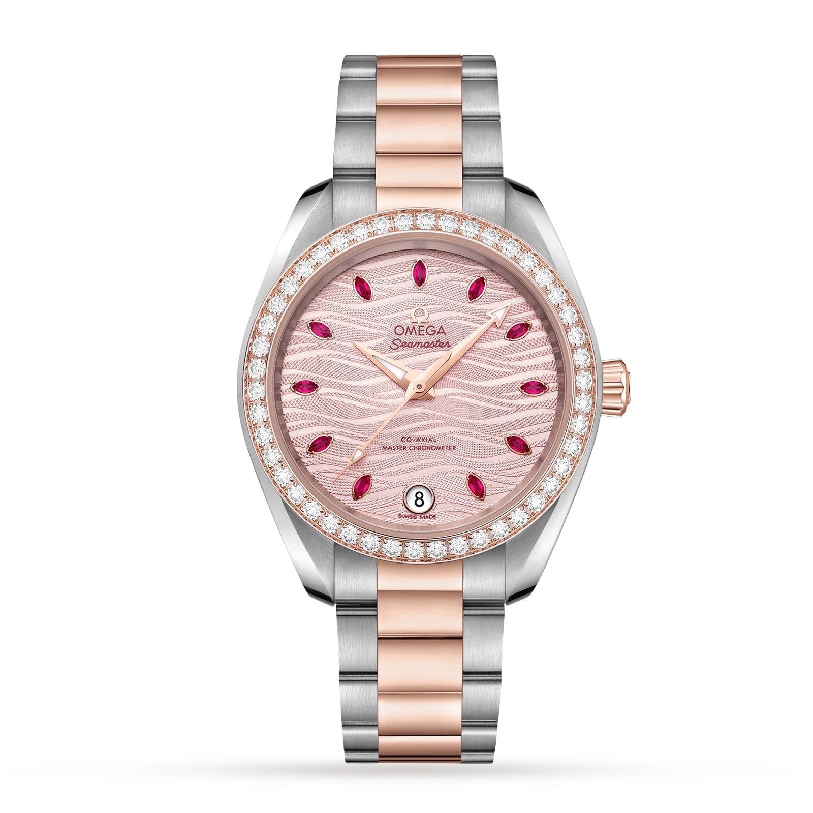 A distinguished, elegant Seamaster combining luxury materials with an ocean heritage 34mm stainless steel and 18K Sedna™ gold ladies watch Pale pink, wave-embossed dial with 11 marquise-cut ruby hour markers Diamond-set bezel and 18K Sedna™ gold crown OMEGA Master Chronometer calibre 8800 for reliability and precision THE LUXURY SEAMASTER The Seamaster Aqua Terra is a new chapter in the illustrious ocean-going heritage of OMEGA, a new take on the classic Seamaster design that can be worn in any context - just as comfortable swimming or diving as it is worn on more formal occasions. Enhanced with several luxurious design touches, this elegant ladies timepiece includes inlaid marquise-cut rubies for the indexes, shaped in the form of sailboat hulls and a fully diamond-set bezel. The sporty practicality of this range is maintained with the 150m water resistance and 5 year OMEGA guarantee. TECHNICAL EXCELLENCE The Aqua Terra model was one of the first timepieces to be powered by OMEGA’s revolutionary Co-axial escapement, so this timepiece continues the tradition of excellence with the latest Master Chronometer, the calibre 8800. This METAS certified automatic movement is rated to resist magnetic fields up to 15000 gauss, with the additional benefit of needing far less regular servicing than a typical automatic movement. 11 marquise-cut ruby hour markers bring a touch of fire to the pale pink, wave- embossed dial in concert with the diamond bezel. The stainless steel and 18K Sedna™ gold bracelet matches the case beautifully and is held in place with a butterfly clasp. In true Seamaster style, the wave-edged caseback houses a sapphire crystal for viewing OMEGA's beautiful, industry-leading movement, in this case the calibre 8800.