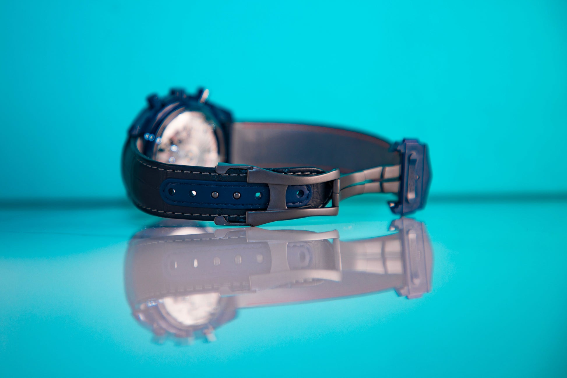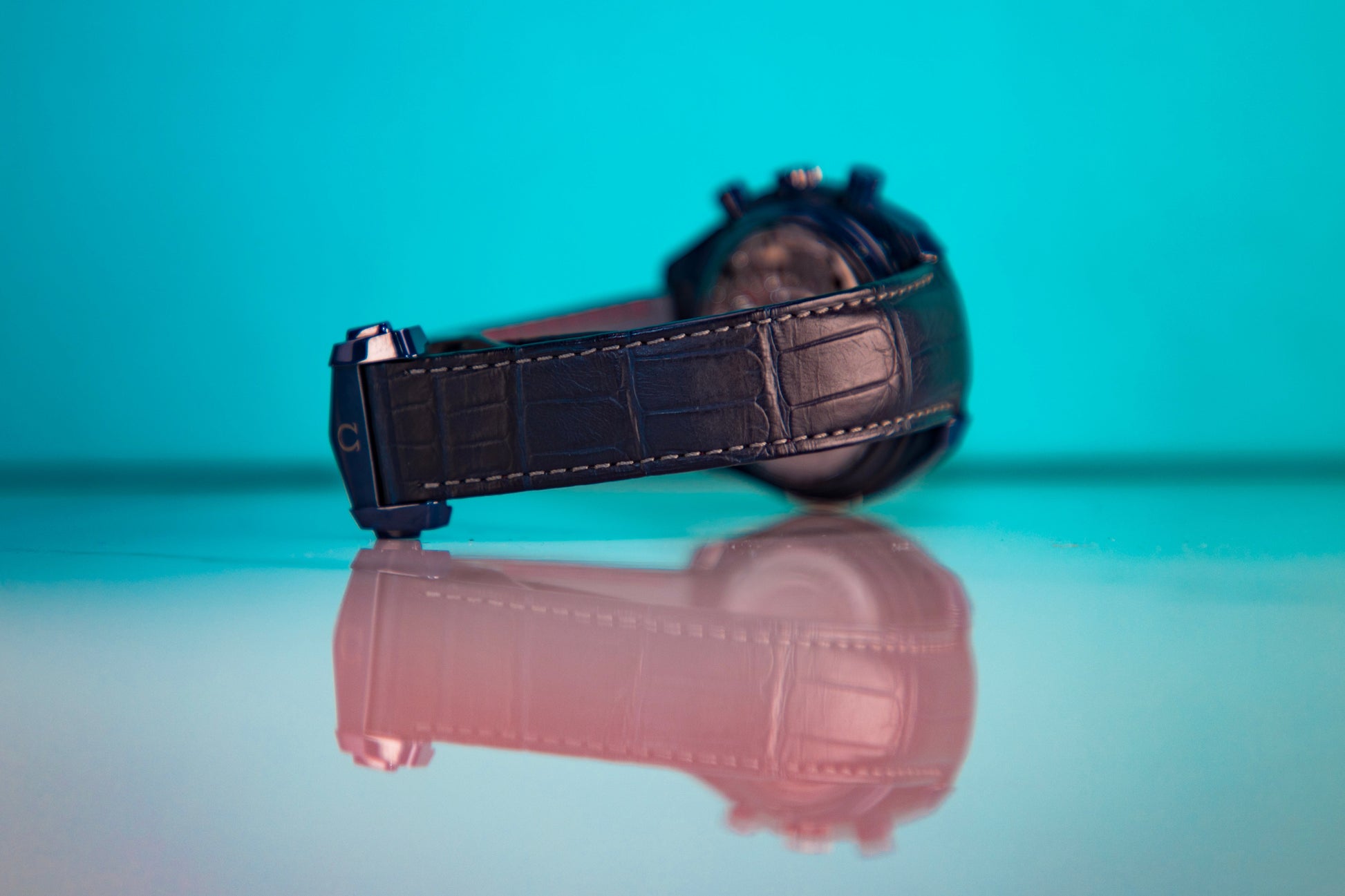 The 44.25 mm watch features a blue ceramic case complemented by a blue ceramic bezel ring with Liquidmetal™ tachymeter scale. It is presented on a blue leather strap with a blue ceramic, ceramised titanium foldover clasp.