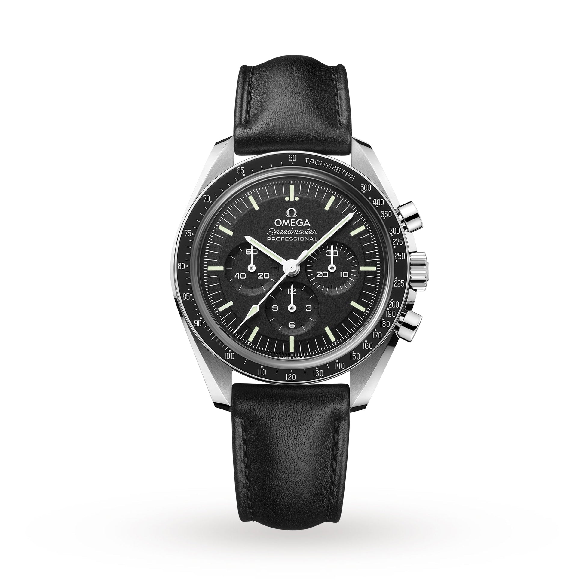 Inspired by the 4th generation Speedmaster style worn on the moon Precision and reliability provided by the 3861 calibre movement 42mm stainless steel case secured with a stainless steel bracelet Central chronograph function Co-Axial escapement for long-lasting precision TAKING TIMEKEEPING TO NEW HEIGHTS Inspired by the 4th generation Speedmaster style worn on the moon, the Speedmaster Moonwatch captures the heart of Omega’s adventurous pioneering spirit, making it one of the world’s most iconic timepieces. Demonstrating the brand’s commitment to evolution, this new 2021 edition offers greater reliability, precision and excellence with Master Chronometer certification. SUPERIOR TIMEKEEPING Presented in an asymmetrical stainless steel case paired with a black leather strap, this legendary timepiece features a black step dial with applied OMEGA logo and the iconic dot over 90 on the anodised aluminium bezel ring. The dial features a small seconds sub-dial, 30-minute and 12-hour recorders, as well as central chronograph functionality. Providing unrivalled precision, the 9908 calibre movement has been officially certified by the prestigious Swiss Federal Institute of Metrology (METAS) and is water resistant to 5 bar (50 metres).