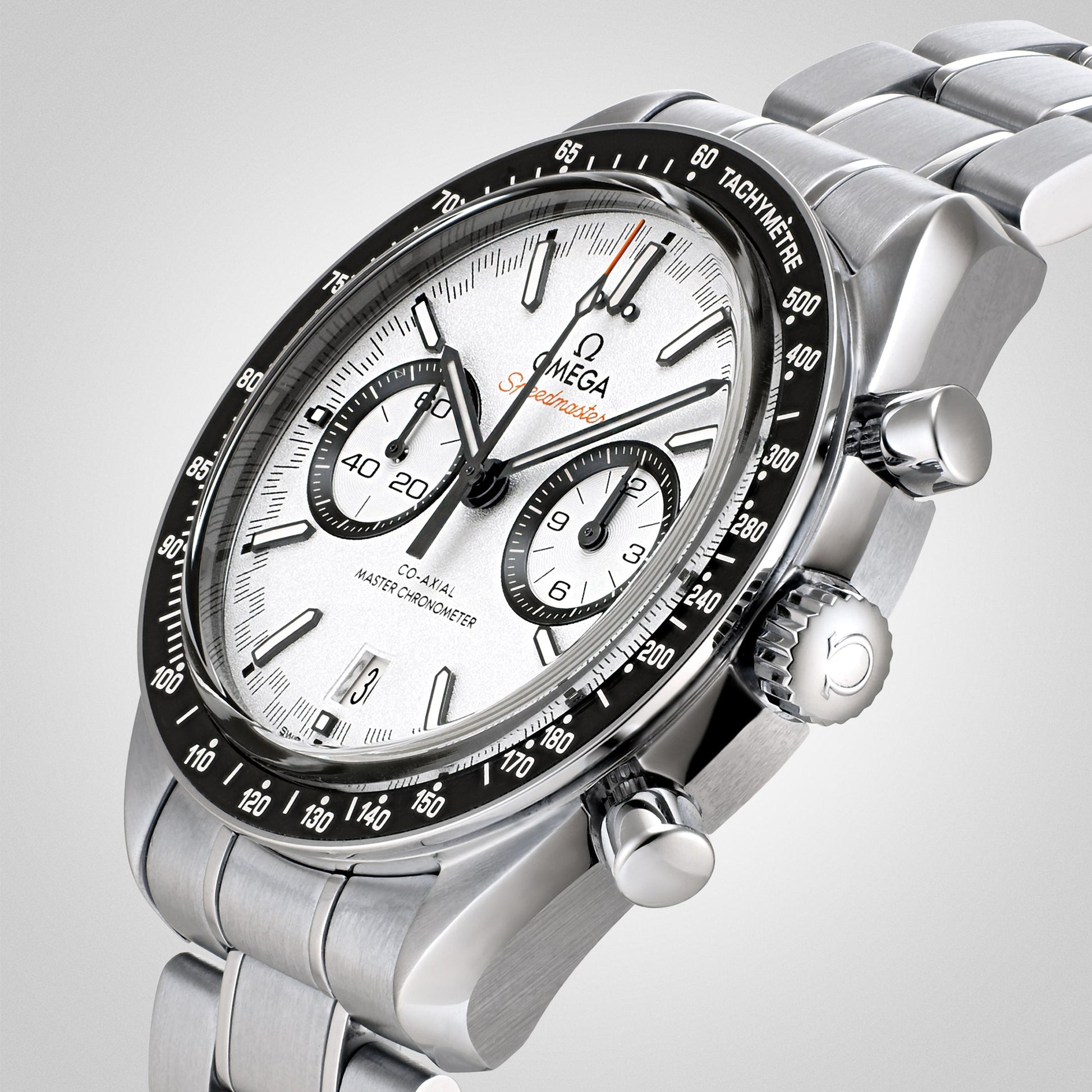 A celebration of OMEGA’s racing achievements Speedmaster heritage featuring the 9900 calibre movement 44.25mm stainless steel case secured with a stainless steel bracelet Anti-magnetic, chronograph and tachymeter features Time zone function DESIGNED FOR THE TRACK The Speedmaster Racing collection celebrates the iconic model’s racing heritage. A distinctive racing style minute track and vivid orange details add a sporty touch to the white dial, while 12-hour and 60-minute recorders add enhanced functionality for the racetrack. GEAR-SHIFTING FEATURES This 44.25mm watch features a stainless steel case paired with a black ceramic bezel ring and stainless steel bracelet. The white dial features two blackened chronograph sub-dials and a 6 o’clock date window. Powering the timepiece, a 9900 calibre movement ensures unrivalled precision and accuracy, even on the racetrack. The calibre is certified by the prestigious Swiss Federal Institute of Metrology (METAS), is water resistant to 5 bar (50 metres) and is resistant to magnetic fields reaching 15,000 gausses.