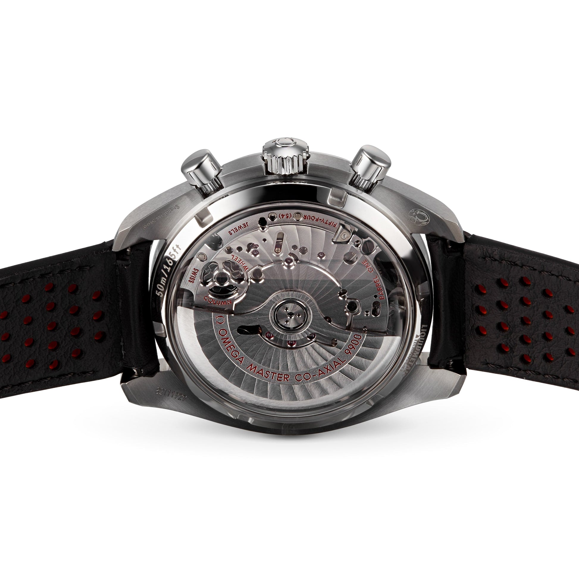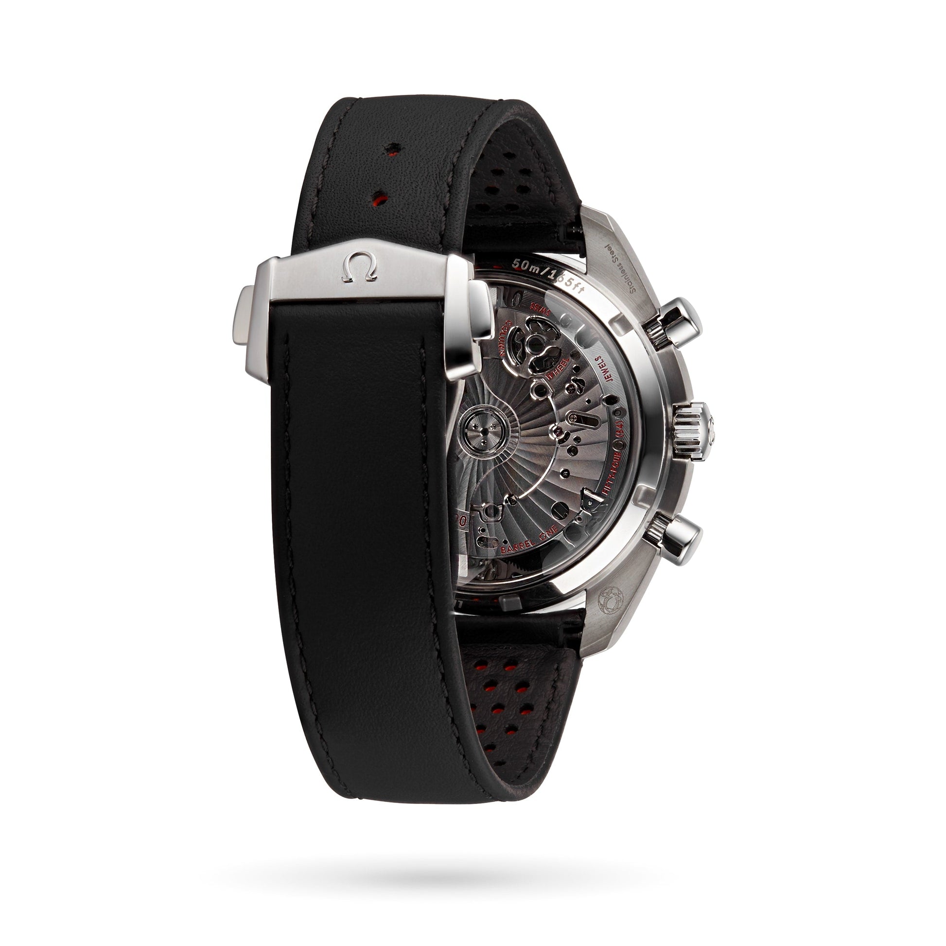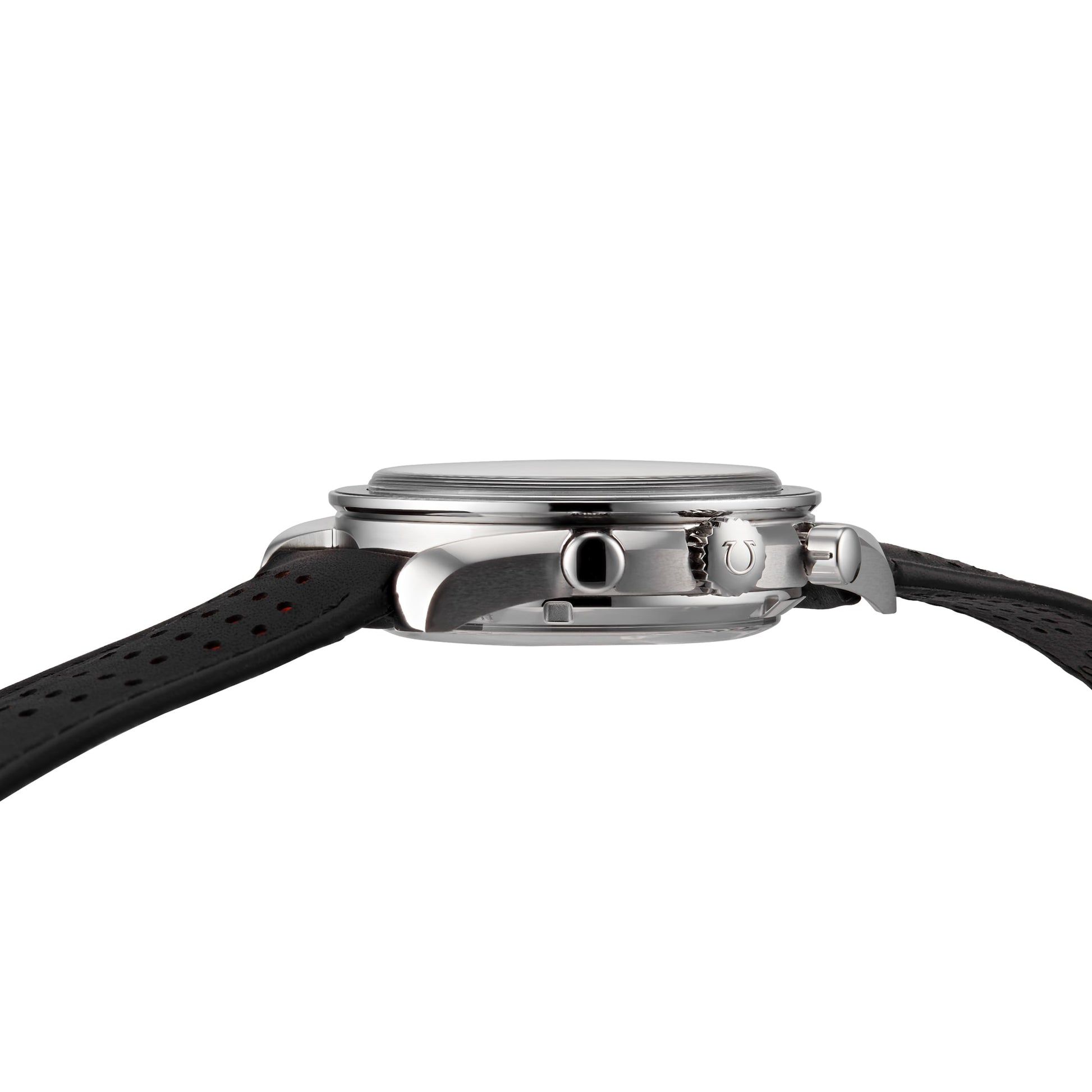 A tribute to OMEGA’s motor heritage Driven by the 9900 calibre movement for flawless precision 44.25 mm stainless steel case paired with black leather strap Sporty design features Officially certified Master Chronometer by METAS A RACING HERITAGE The Speedmaster Racing collection celebrates the iconic model’s racing heritage. A distinctive racing-style minute track and vivid orange details add a sporty touch to the black dial, while 12-hour and 60-minute recorders add enhanced functionality for the racetrack. EXCELLENT DRIVE This fast-paced model boasts a 44.25 mm stainless steel case, a matt black dial featuring a racing-style minute track, and a black ceramic bezel with a tachymeter scale to measure speed based on distance. The black leather strap reveals an orange interior, coinciding with the orange and white varnished hands. The arrowhead indexes are 18K white gold with white Super-LumiNova for enhanced visibility. Driven by the 9900 calibre movement, this master chronometer guarantees the highest level of precision.