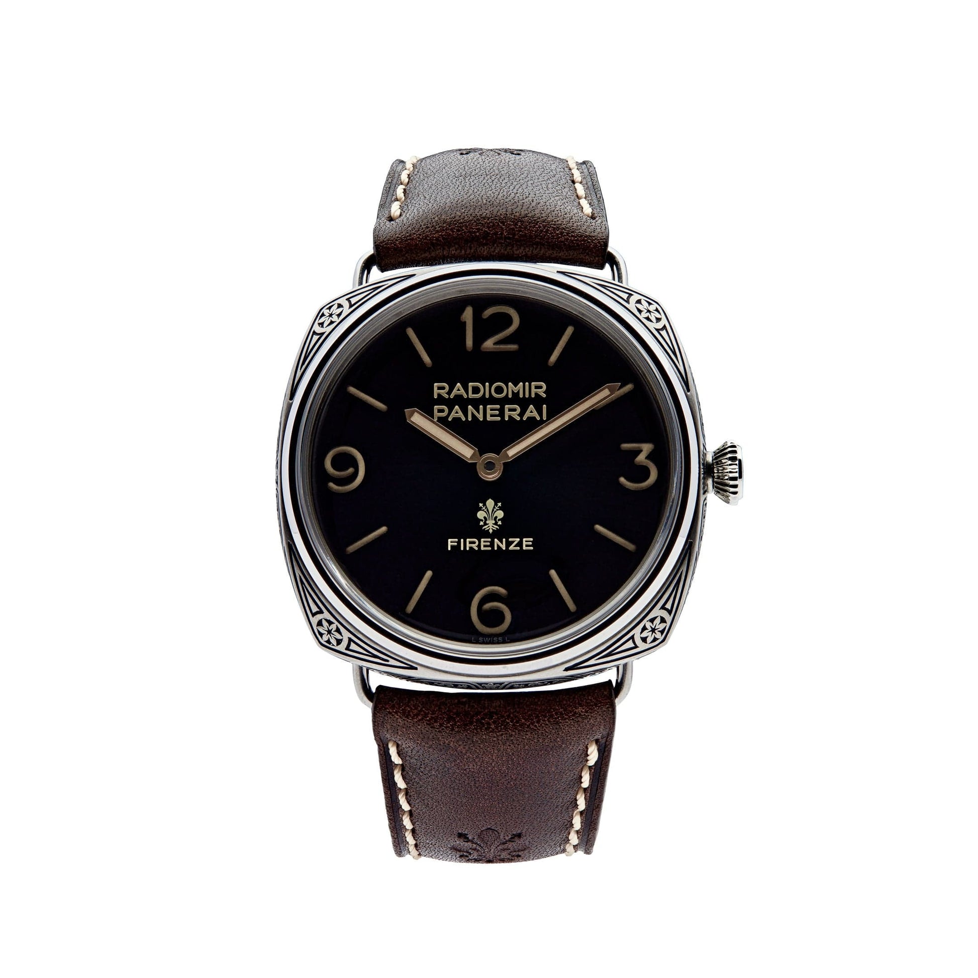 This Radiomir Firenze is crafted in an engraved stainless steel case measuring 47mm. The sun-brushed black dial features luminous Arabic numerals and hour markers. The watch comes on a dark brown calf leather strap.