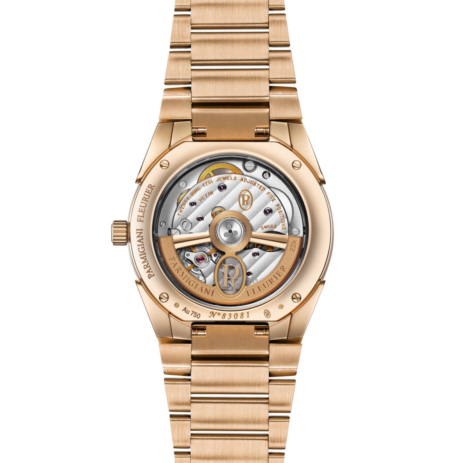 The TONDA PF Automatic Rose Gold Set Sand Gold Set by Parmigiani Fleurier epitomizes the elegance of feminine haute horlogerie. Sumptuous in rose gold and adorned with diamonds, it evokes lightness and fluidity, with diamonds from the case to the bracelet clasp creating a unique visual identity. The finely sculpted gold work allows the diamonds to shine fully, showcasing perfect mastery of the material. The carefully placed and partially bordered precious stones appear to float between the rose gold links of the bracelet. The pavé clasp subtly reveals the PF logo of the Maison and offers a personal delight, adding a sensual and tactile dimension. This jeweled watch sacrifices nothing in technical sophistication, featuring a double-barrel automatic movement, a finely knurled bezel, a hand-guilloché Grain d’orge dial, and an exceptionally polished satin-finished bracelet. Combining purism and opulence, and boasting unparalleled ergonomics, the TONDA PF Automatic Rose Gold Set Sand Gold Set rests gracefully on the wrist, housing a complex and fascinating universe of haute horlogerie.