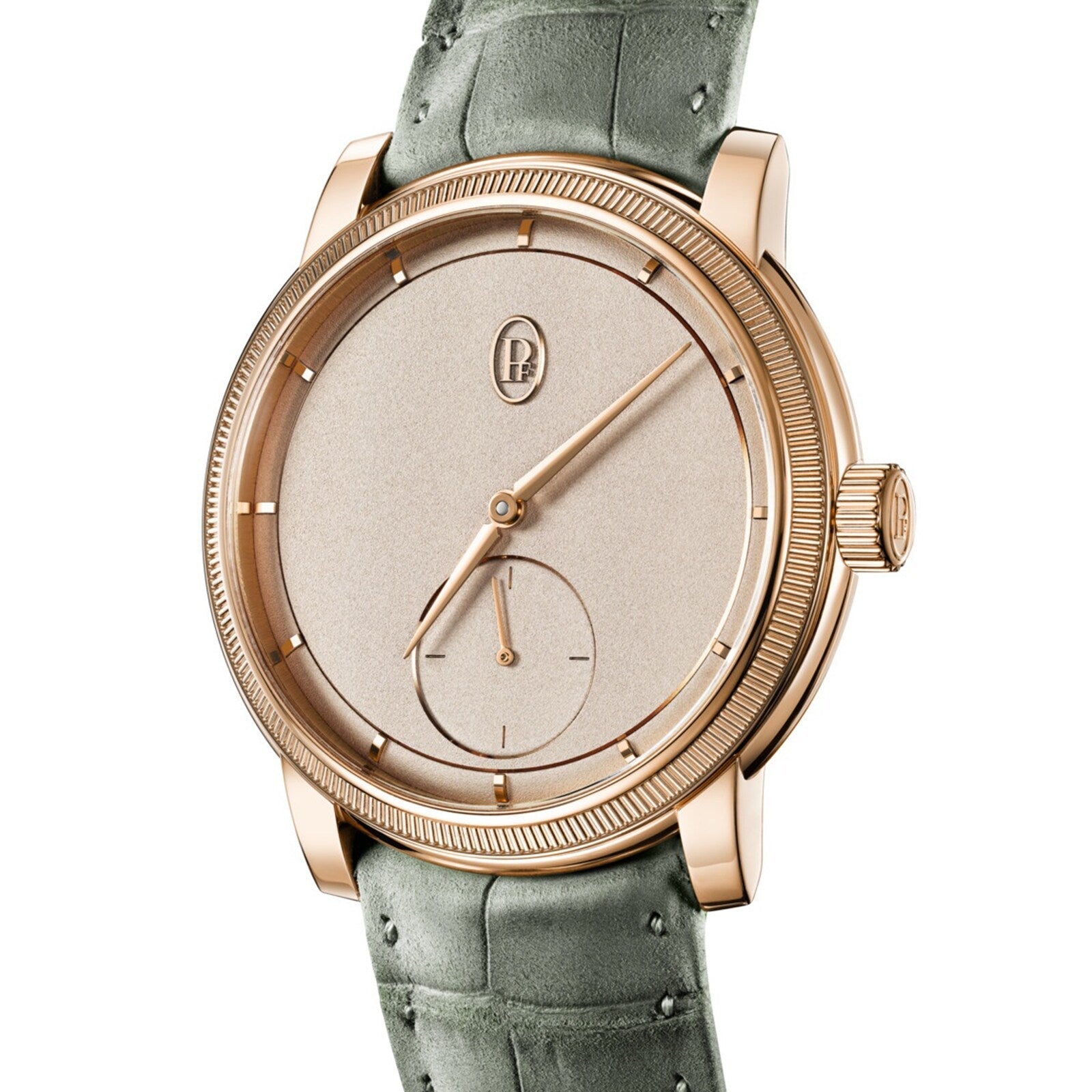 The TORIC Petite Seconde Rose Gold Sand Gold by Parmigiani Fleurier marks the bold revival of the TORIC collection, an emblem of redefined masculine elegance. At its heart beats the PF780 caliber, a rose gold manufacture movement whose innovative architecture, with large surfaces acting as bridges in a pure geometric arrangement, transcends technical achievement to become a major stylistic element. The rose gold case, complemented by a knurled bezel—the collection's hallmark—displays minimalist elegance. Its clean design, free of rough edges or sharp angles, ensures a smooth transition to the bracelet. This model stands out for its comprehensive use of rose gold, from the polished case and knurled bezel to the movement, dial, and hands, embodying ultimate harmony and nobility. The rose gold dial, meticulously hand-grained and beveled with exemplary craftsmanship, features an exceptionally smooth surface that captures and disperses light, creating a soft visual effect. This homage to elegance is embodied in a Grey Celadon nubuck alligator leather strap with "punto a mano" stitching, combining refined aesthetics with enhanced comfort. The TORIC Petite Seconde Rose Gold Sand Gold, more than just a watch, is a style statement that invites reflection on contemporary elegance.
