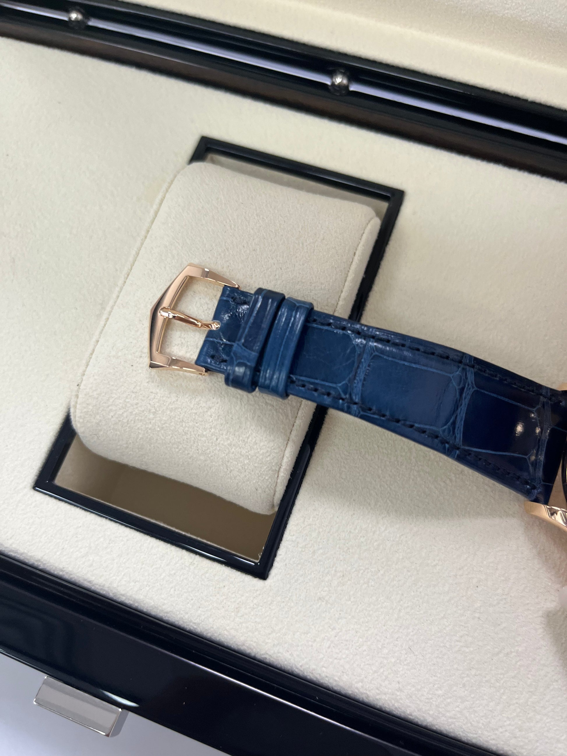 The rose gold case is distinguished by its sophisticated construction, with a concave bezel and hollowed flanks.