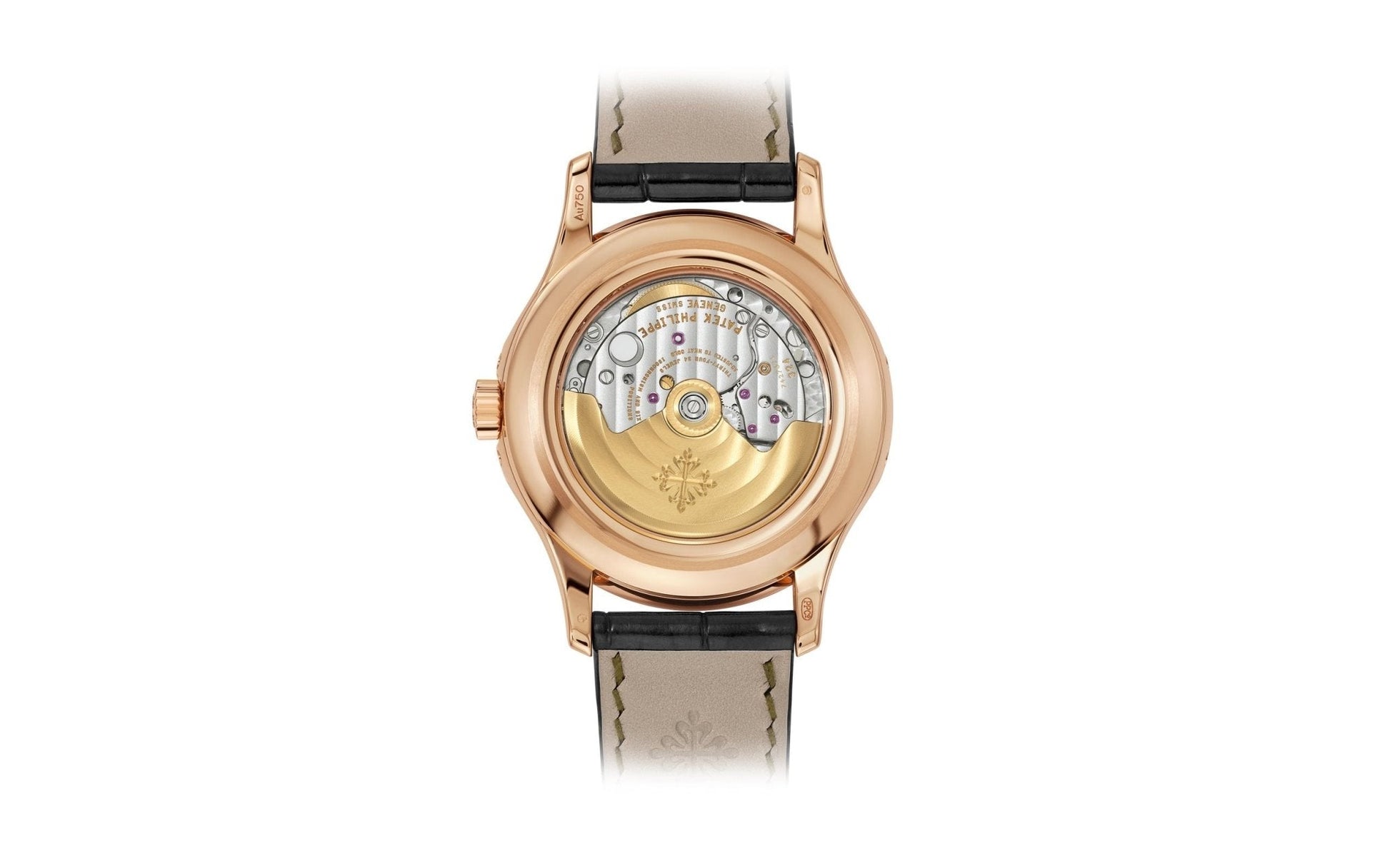 The transparent sapphire crystal enables one to admire self-winding Caliber 324 S QA LU 24H, equipped with the ingenious patented Patek Philippe Annual calendar mechanism requiring only one manual adjustment per year, at the end of the month of February.