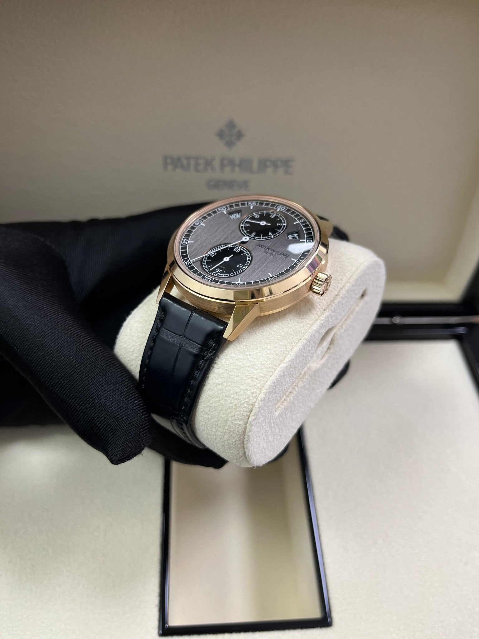 Patek Philippe revisits the unique style of its Annual Calendar Regulator by presenting it in rose gold, paired with a two-tone dial in graphite and ebony-black with a vertical satin finish.