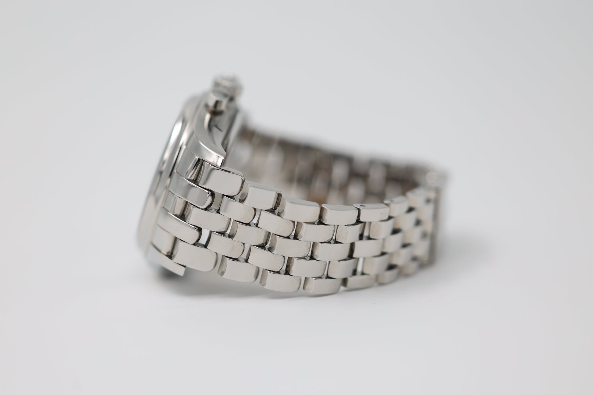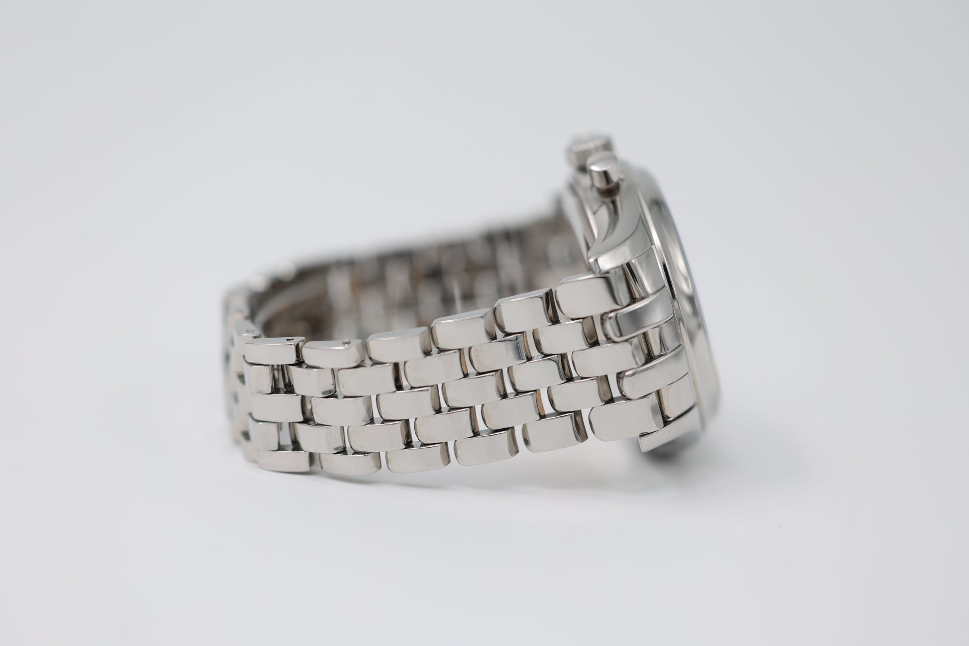 The Patek Philippe Annual Calendar Chronograph 5960/1A-001 stands as a modern icon in the world of haute horlogerie. Crafted in stainless steel—a rarity for Patek Philippe—it combines sophisticated complications with a refined, contemporary design. The silver opaline dial is perfectly balanced, featuring applied blackened gold hour markers, day, date, and month apertures displayed in elegant symmetry, and a chronograph with a monocounter at 6 o’clock.