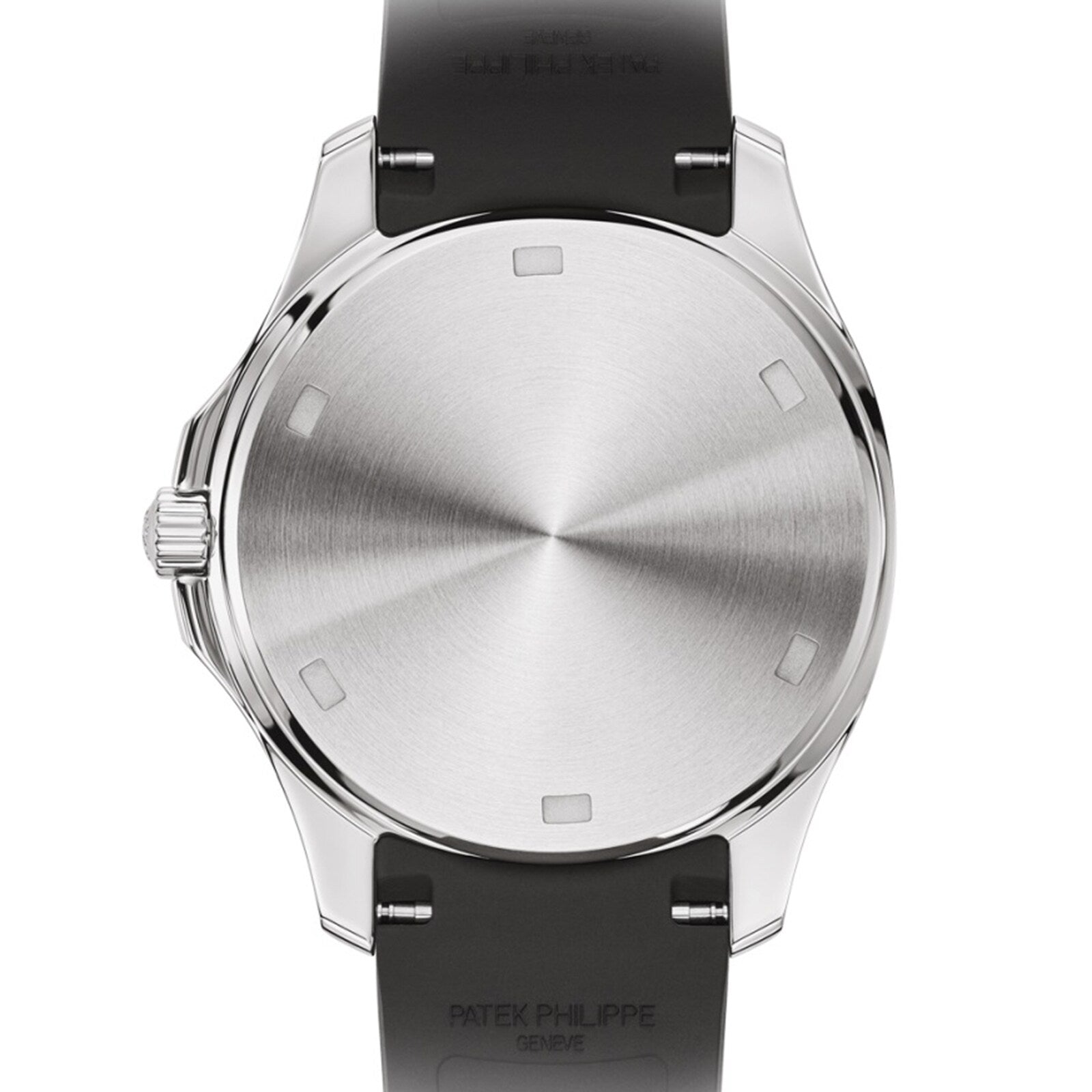 Patek Philippe reinterprets the quartz Aquanaut Luce in stainless steel with a larger diameter (38.8 mm) and a new integrated composite strap. This epitome of contemporary casual chic is attired in an elegant shade of black adorning the dial and matching strap. Water-resistant to 120m, the rounded octagonal case is enhanced by polished and satin finishes. The bezel is lit up by a row of 48 diamonds (~1.11 ct). The patented folding clasp is secured by four independent catches. WATCH Quartz movement. Caliber E 23- 250 S C. Date in an aperture. Sweep seconds. DIAL Black, embossed with Aquanaut pattern, gold applied numerals. CASE Steel. Screw- down crown. Solid case back. Water-resistant to 120m. Diameter (10 - 4 o'clock): 38.8mm. Height: 7.9mm GEMSETTING 48 Diamonds: ~1. 11 ct. (bezel). BRACELET/STRAP Composite material, black. Aquanaut fold-over clasp. CALIBER E 23-250 S C - Quartz Date in aperture. Sweep seconds. Diameter: 23.9mm Height: 2.5mm Parts: 80 Jewels: 8 Quartz frequency: 32,768 Hz Power source: Silver oxide battery 1. 55 V Battery life: 3 Years
