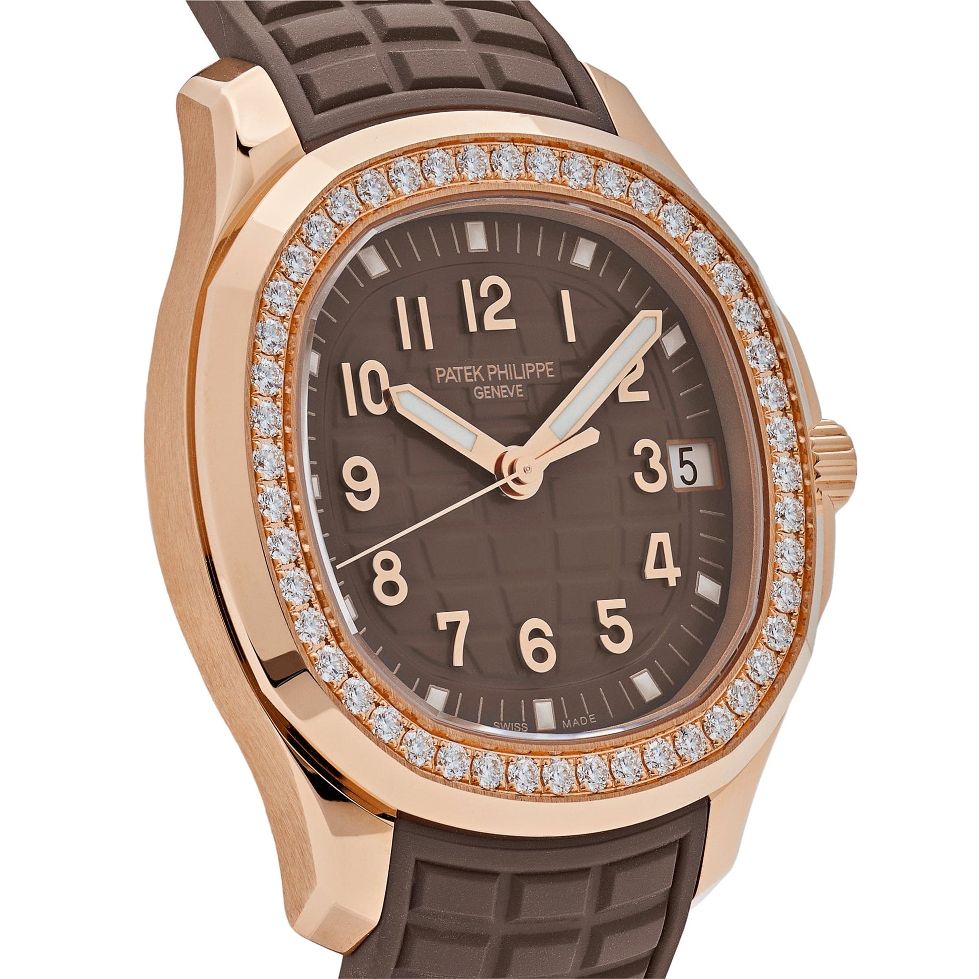 This Patek Philippe Aquanaut is crafted in a rose gold case measuring 38.8mm adorned with 48 diamonds on the bezel. The brown dial is embossed with the Aquanaut pattern and gold applied numerals. The watch comes on a brown rubber strap with a rose gold Aquanaut fold-over clasp.