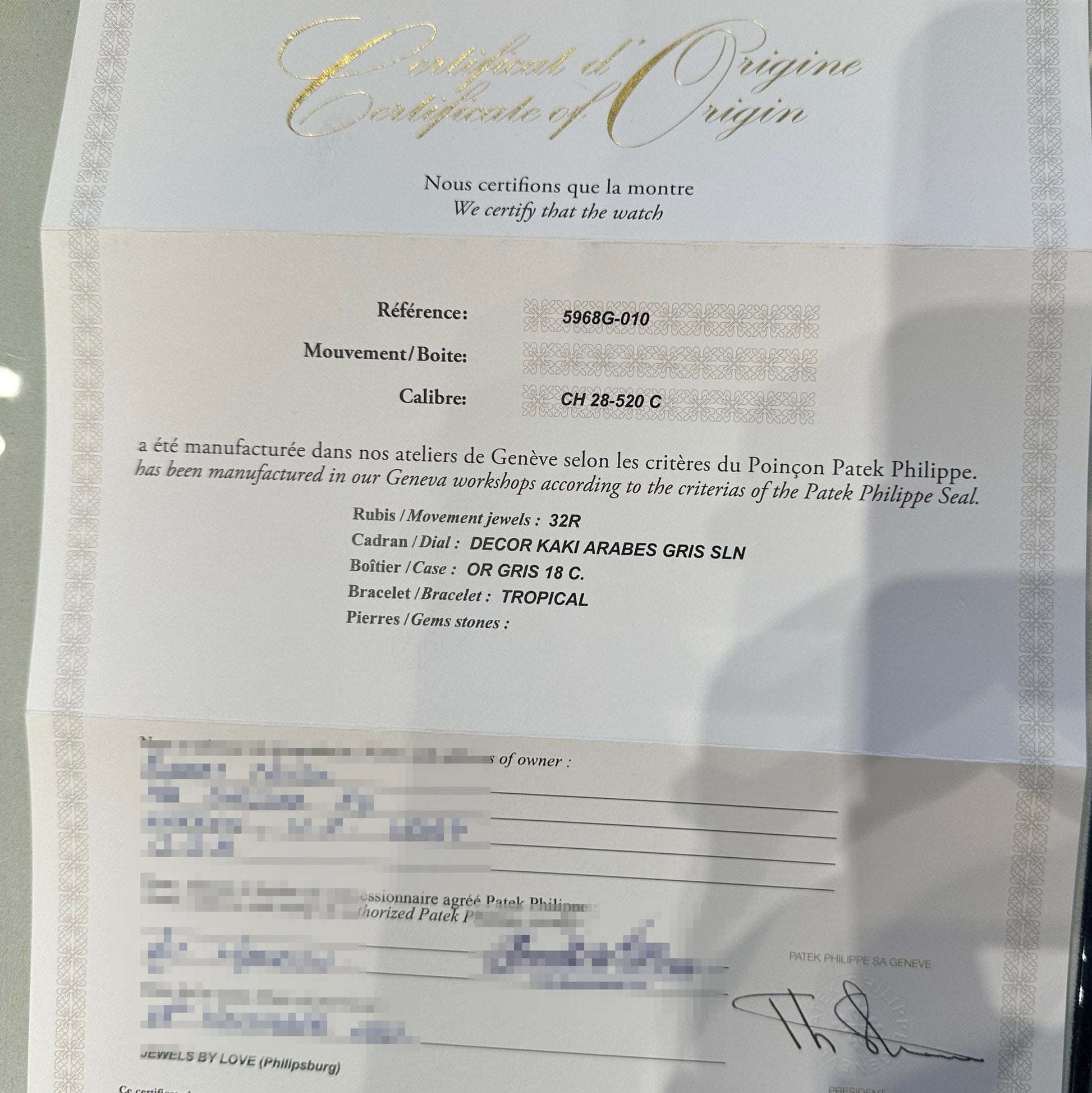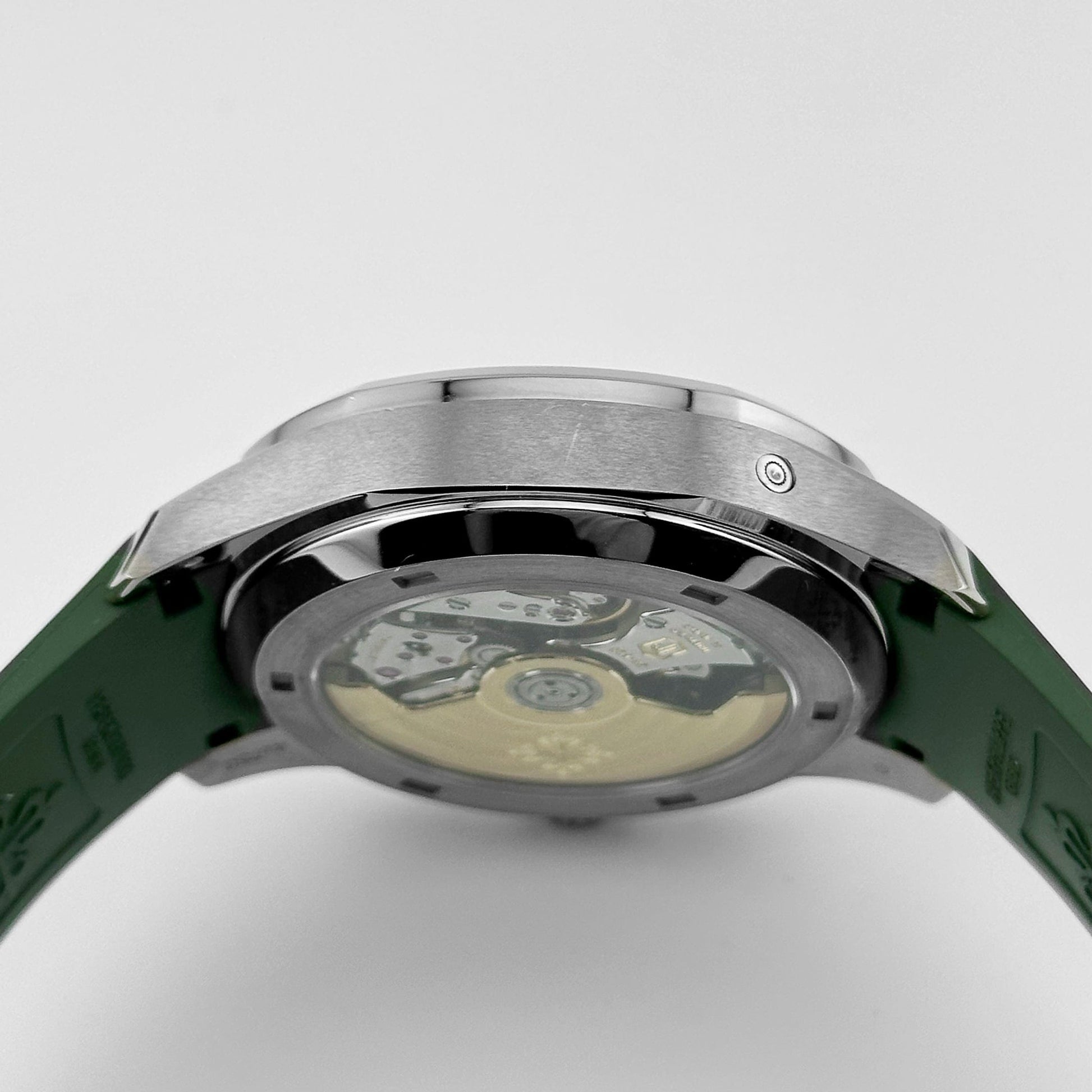 Measuring 42.2mm in diameter, the white gold case is complemented by a matching khaki green composite strap, ensuring both durability and comfort. The combination of the unique color scheme and the chronograph complication makes the 5968G-010 a standout piece within the Aquanaut collection, appealing to collectors who value both functionality and distinctive design. Its exclusivity and bold aesthetic contribute to its desirability in the secondary market.