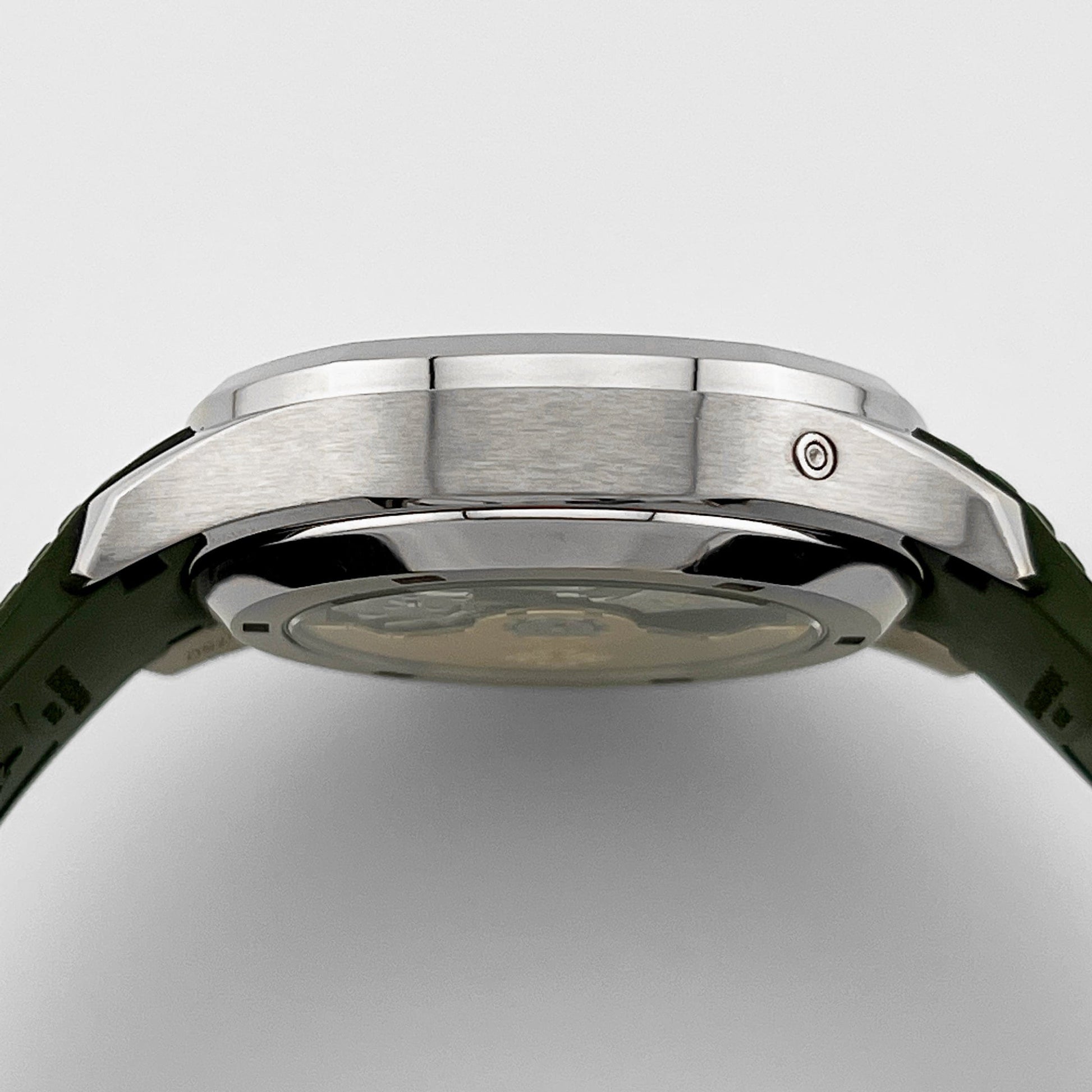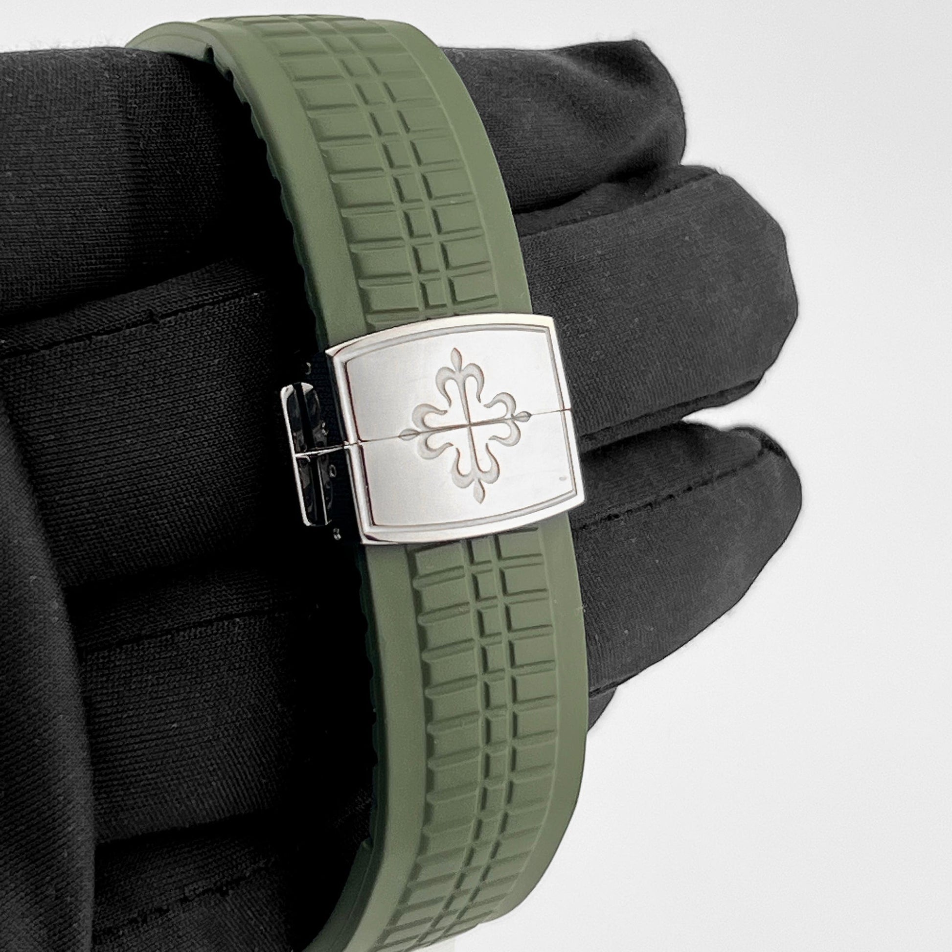 Measuring 42.2mm in diameter, the white gold case is complemented by a matching khaki green composite strap, ensuring both durability and comfort. The combination of the unique color scheme and the chronograph complication makes the 5968G-010 a standout piece within the Aquanaut collection, appealing to collectors who value both functionality and distinctive design. Its exclusivity and bold aesthetic contribute to its desirability in the secondary market.