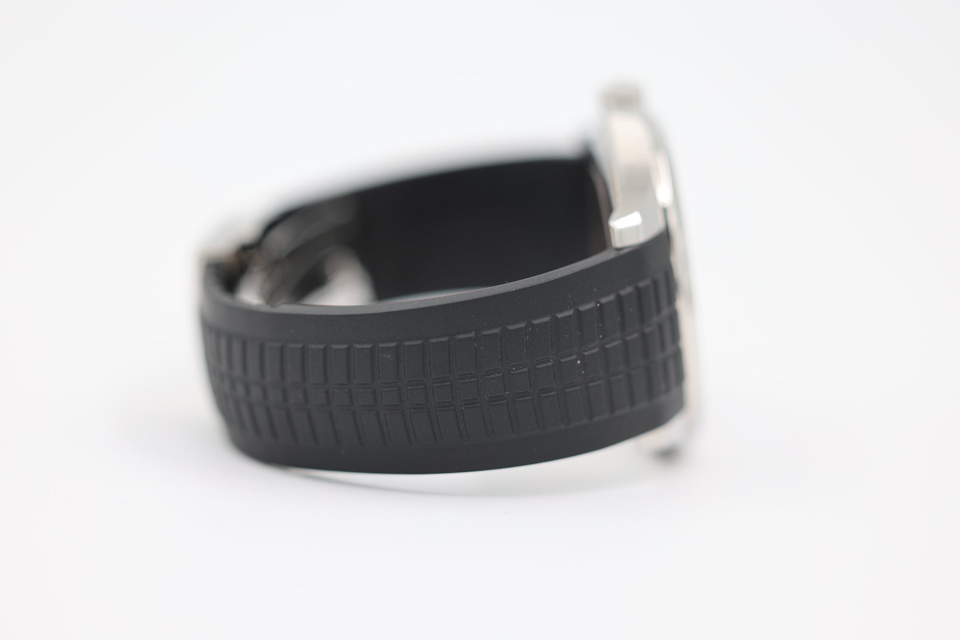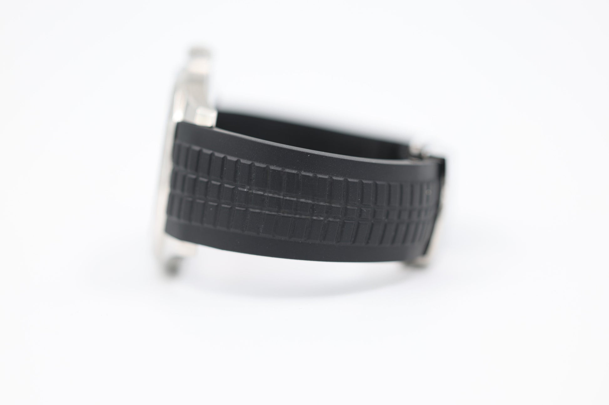 This 2018 edition features a stainless steel 40mm case paired with a bold embossed black dial, creating a striking yet versatile aesthetic. The white gold applied numerals and luminescent markers provide excellent legibility, while the date window at 3 o’clock adds practical functionality.