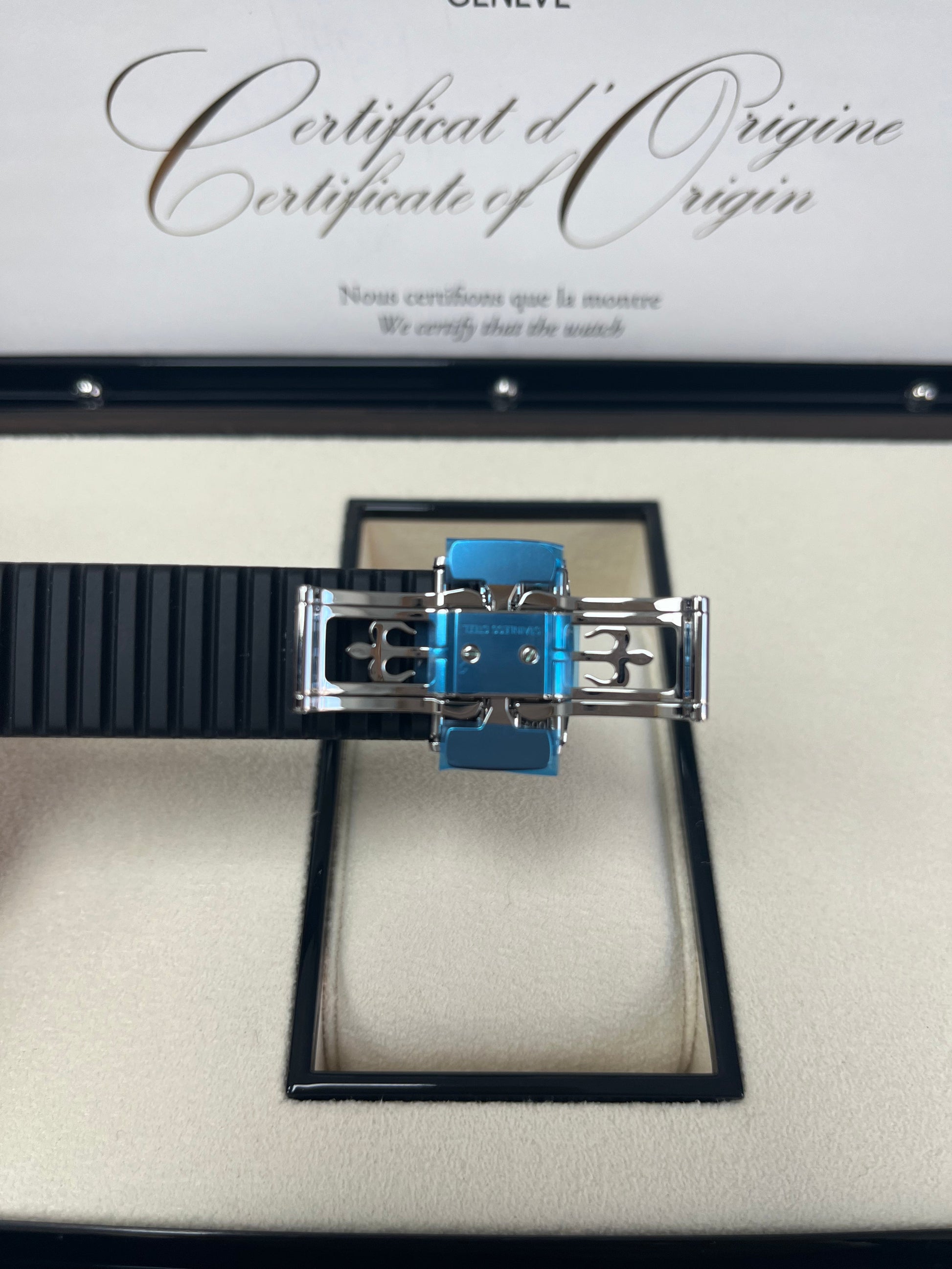 This Aquanaut 5968A features striking orange second and chronograph hands on a black embossed dial. The white gold-applied numerals are luminescent, emitting a teal-green glow in the darkness.