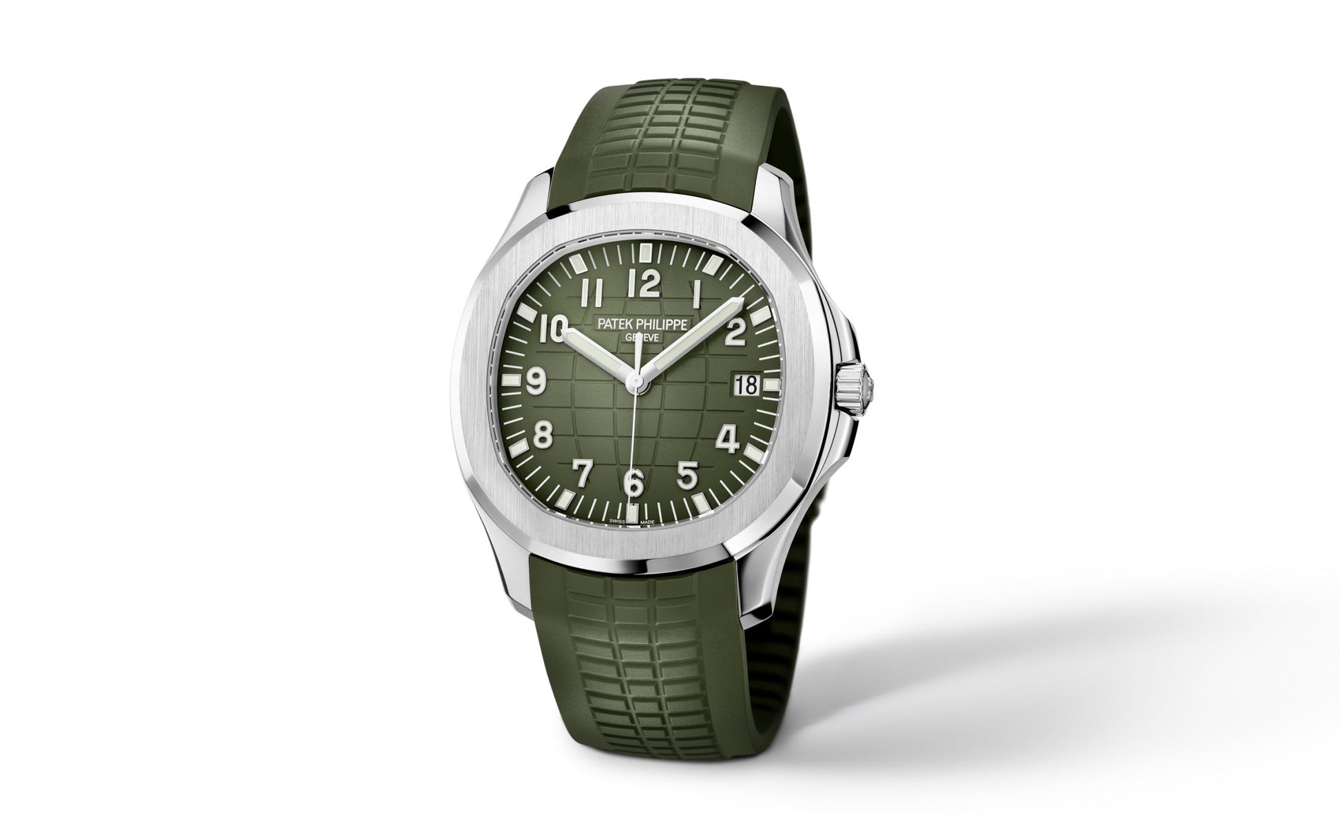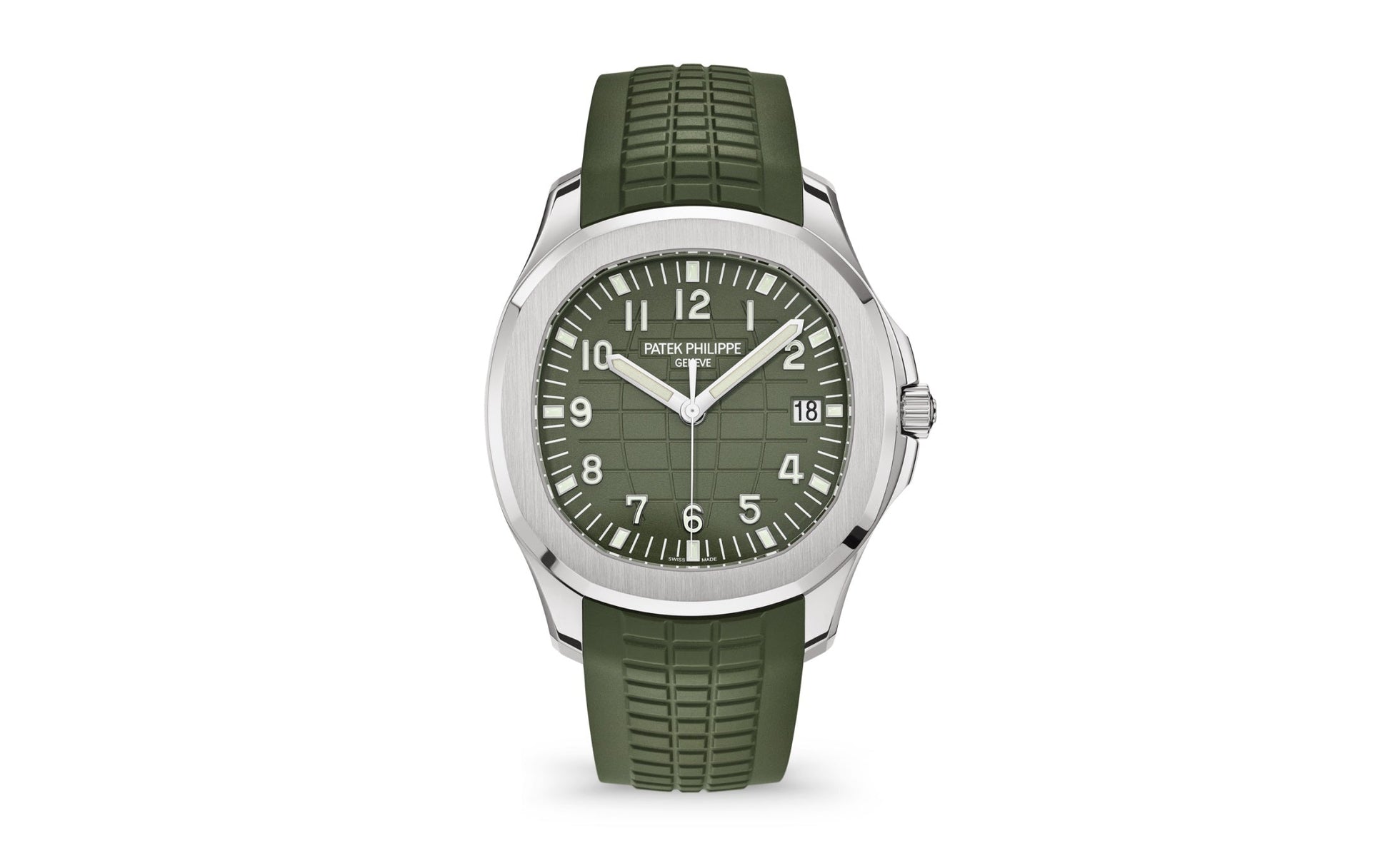 New Patek Philippe Aquanaut Jumbo Date Sweep Seconds luxury sports watch, 42.2 mm, 18k White Gold, Ref. 5168G-010. They are reliable and practical, modern and somewhat unexpected, inspired by Nautilus. Their 18k White Gold case features a rounded, cushion-shaped octagon that is unmistakable. It has polished crown guards protruding from the right side of the watchcase to protect her. The beautiful embossed Khaki green dial is one tone lighter than the strap, which has the same geosphere pattern. This color combination of dial and strap is the main attraction of this model. Perfectly readable large applied polished Arabic numerals made of 18k White Gold with luminescent coating in the form of hour markers look harmoniously. On the outer rim of the dial, a silver second track is printed with fairly wide luminous marks located every 5 minutes. The time is indicated by large polished 18k White Gold luminescent rod-shaped hour and minute hands, as well as a thin and elegant Sweep Seconds hand. The aperture date indicator is traditionally located at the 3 o'clock position. A polished 18k White Gold screw-down crown with a ribbed edge for a comfortable grip and the Patek Philippe logo is the finishing touch to the perfect picture. The dial is covered with a scratch-resistant sapphire crystal. The case back is also made of sapphire crystal, which allows you to see the magical work of the movement. Against this backdrop, a flat, fixed bezel in 18k White Gold, vertically ground on the front and polished on the sides, provides a wide view of the dial. The finish on the side of the bezel is amazing because at first glance, it looks rounded, but upon closer inspection, you can see the crisp edges playing with the light. The model is equipped with a Patek Philippe caliber 26‑330 S C with a self-winding mechanical movement containing 30 jewels and a power reserve of min. 35 hours - max. 45 hours. This beautiful sport chic watch is presented on a Khaki Green tropical rubber strap, made from a new composite material that is ultra-resistant to wear, salt water and UV radiation. It fastens with Patek Philippe's patented 18k White Gold folding clasp, polished and engraved with the Calatrava cross. Opening the clasp reveals the engraved Patek Philippe logo with the word GENEVE. Water resistant up to 120 m/394ft (12 ATM).