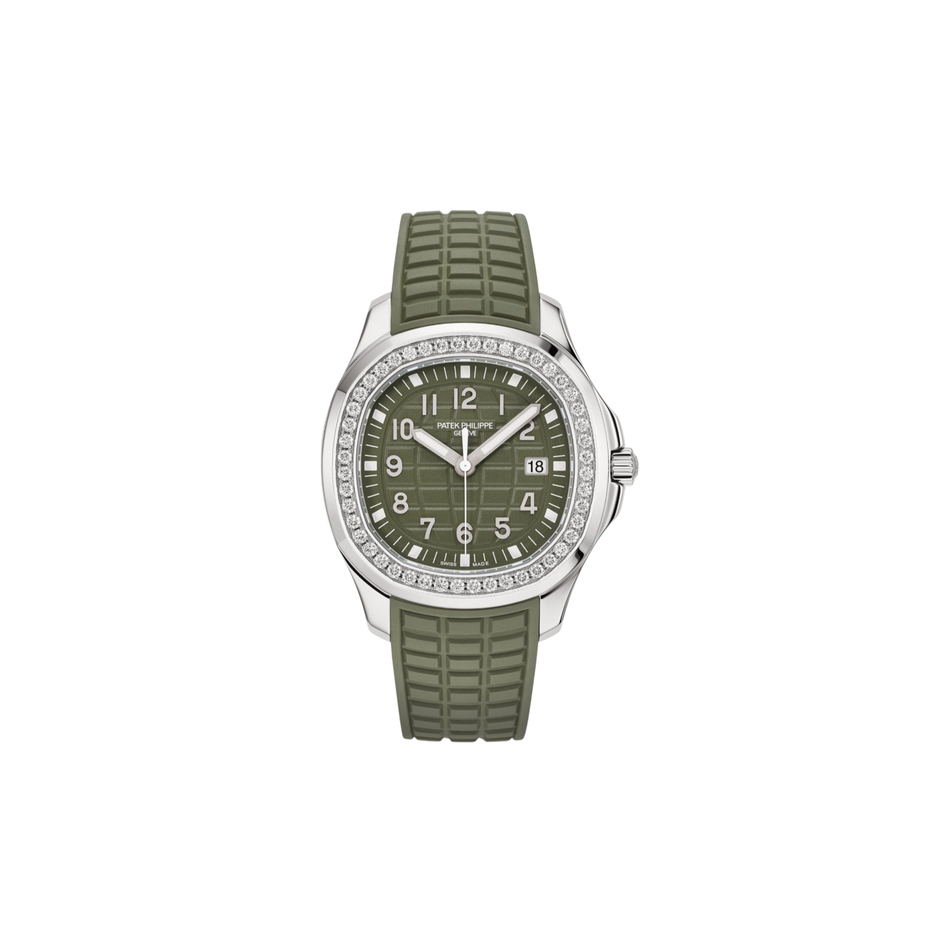 Crafted in stainless steel, the 38.8mm case is enhanced by a brilliant-cut diamond-set bezel (48 diamonds, ~1.11 ct), adding a refined shimmer without compromising its bold aesthetic. The embossed dial mirrors the textured strap for a cohesive and modern look, while luminescent Arabic numerals ensure readability in any light.