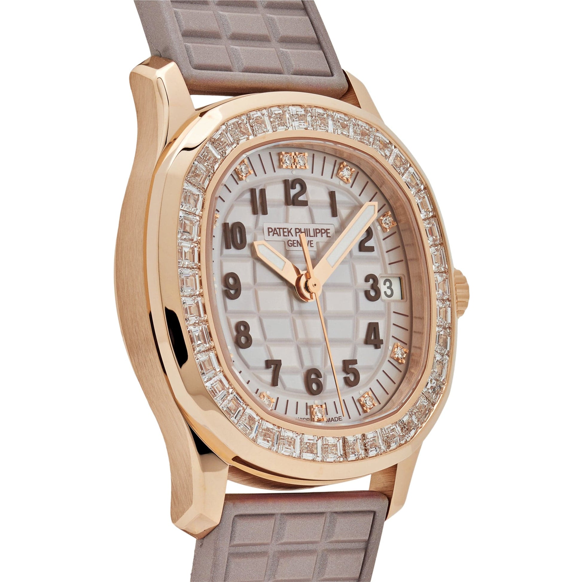 This Patek Philippe Aquanaut Luce 5072R-001 ' Haute Joaillerie' is designed in a 35.6mm 18K rose gold case, decked out in diamonds, and styled on a beige rubber strap. The Mother Of Pearl dial is surrounded by a 40 diamond-set bezel, diamond hour markers, and hosts a date window at 3 o'clock. For a final touch and extra bit of shimmer, the rose gold folding clasp on the strap is set with diamonds.