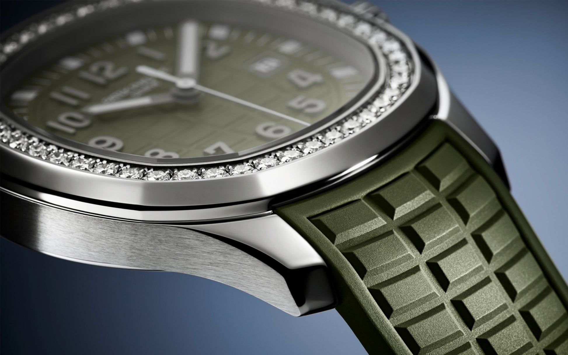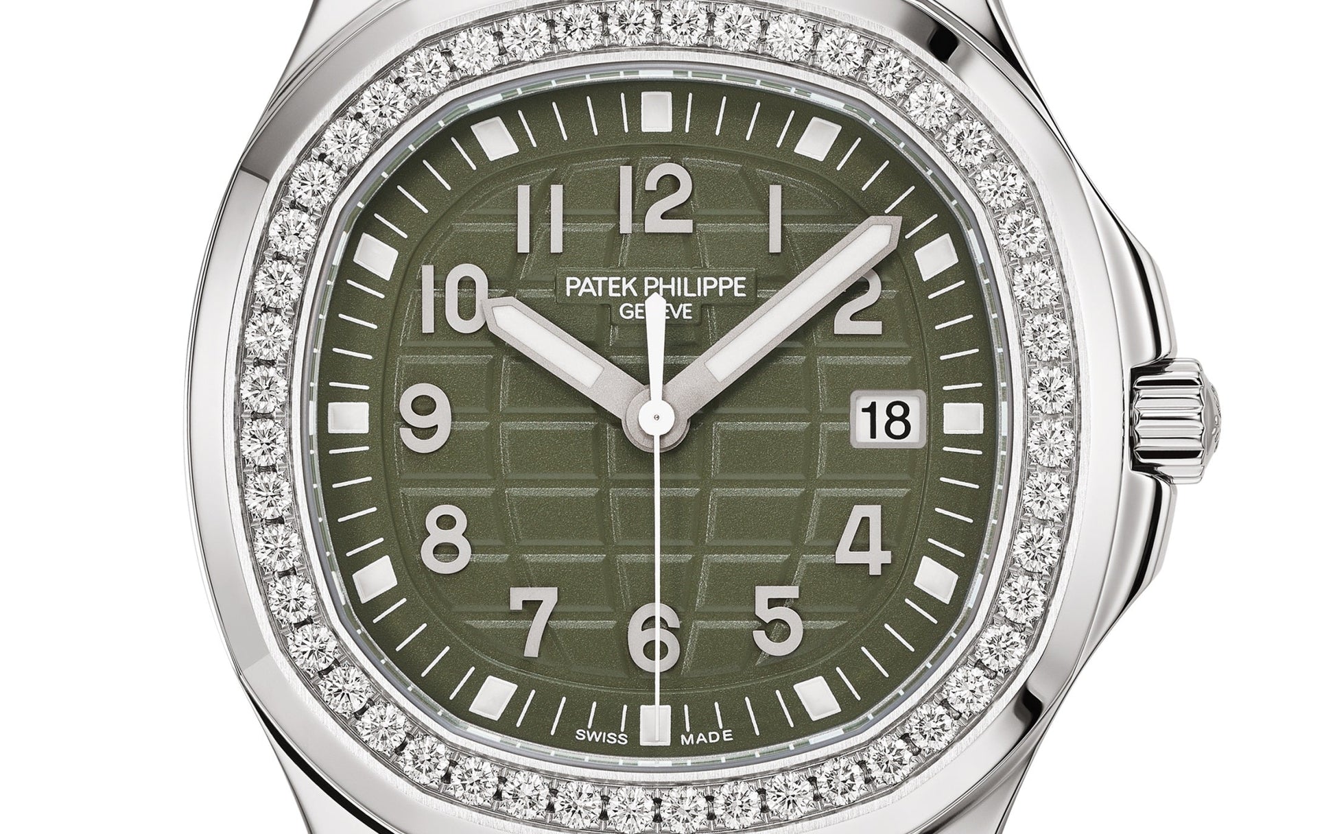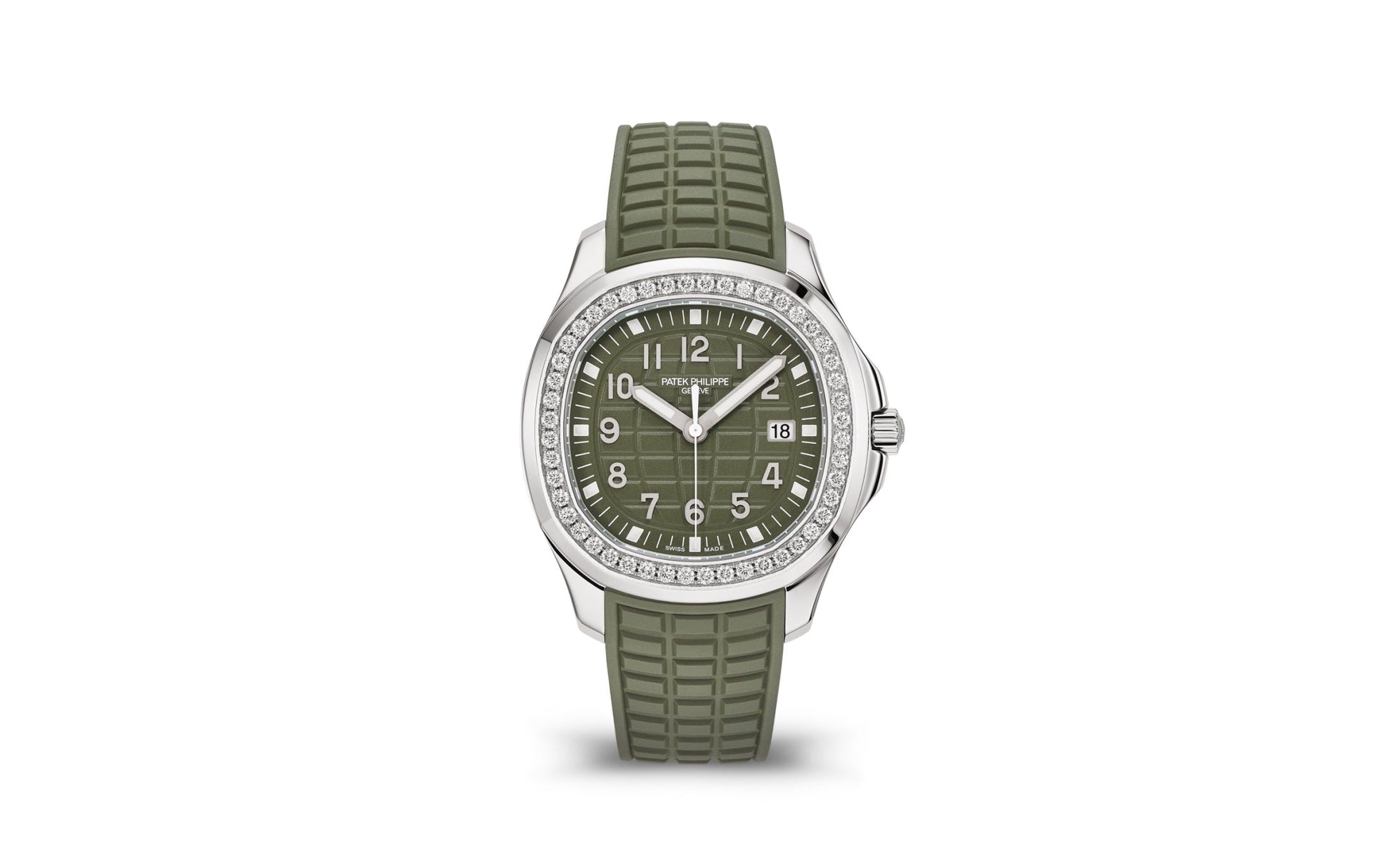 New Patek Philippe Aquanaut Luce luxury Ladies watch, with a larger diameter 38,8mm, Stainless Steel, Ref. 5267/200A-011. The first complex quartz wristwatch in the modern Aquanaut sports collection, which perfectly matches the character of this young and dynamic watch line. His Stainless Steel rounded, pillow-like octagon-shaped case and gently curved lugs, complemented by polished and satin finishes are unmistakable. On a beautiful Khaki green dial with embossed "Aquanaut" harmoniously looks perfectly readable large applied polished Arabic numerals made of 18k White Gold with luminescent coating in the form of hour markers. The manufacturer paid special attention to the second track on the outer rim of the dial, on which applied silvery lines with fairly wide luminous marks located every 5 minutes. Large polished luminous hour and minute hands in 18k White Gold indicate the time. These are complemented by a slim and elegant second hand (Sweep seconds hand). The date window is traditionally at the 3 o'clock position. A polished Stainless Steel screw-down crown with a ribbed edge for a comfortable grip and the Patek Philippe logo is the finishing touch to the perfect picture. The dial is covered with a scratch-resistant sapphire crystal. The screw-down Solid case back is made of Stainless Steel. The elegant highlight of this model is the fixed sparkling stainless steel bezel set with 48 diamonds totaling 1,1cr with polished on the sides, provides a wide view of the dial. The finish on the side of the bezel is amazing because at first glance, it looks rounded, but upon closer inspection, you can see the crisp edges playing with the light. The model is equipped with a Patek Philippe caliber E 23‑250 S C with a Quartz movement powered by a silver oxide battery with a 3-year lifespan. This beautiful sport chic watch is presented on an Integrated Khaki green Composite material strap. He is highly resistant to wear, salt water and UV radiation. The strap are fastens with Patek Philippe's patented Stainless Steel folding clasp, polished and engraved with the Calatrava cross. Opening the clasp reveals the engraved Patek Philippe logo with the word GENEVE. Water resistant up to 120m/394ft (12 ATM).