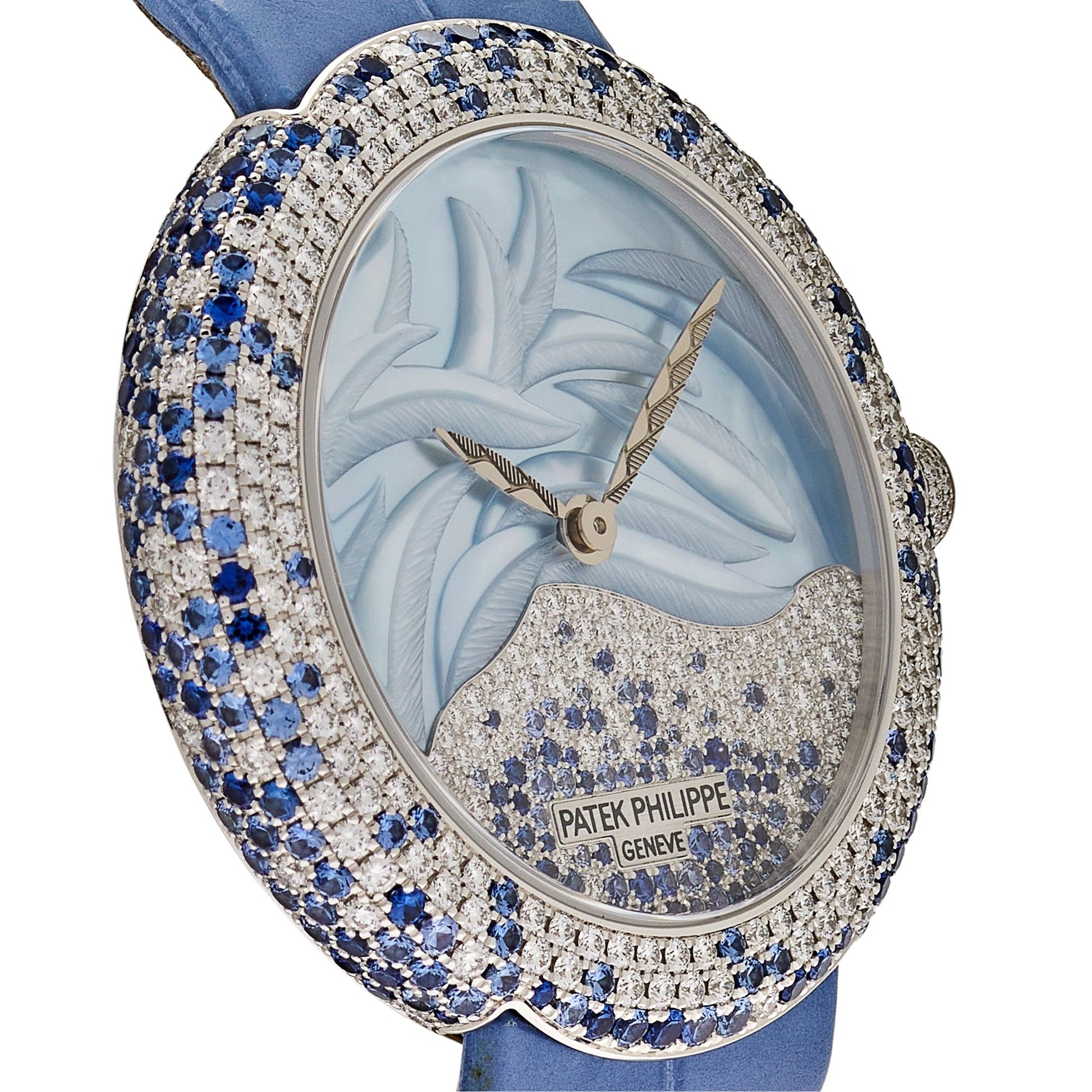 Paired with a supple white satin strap and secured with a white gold buckle set with 27 brilliant-cut diamonds, the 4899/901G-001 is a true work of wearable art. This Calatrava is the epitome of Patek Philippe's mastery in blending horological innovation with exquisite jewelry craftsmanship.