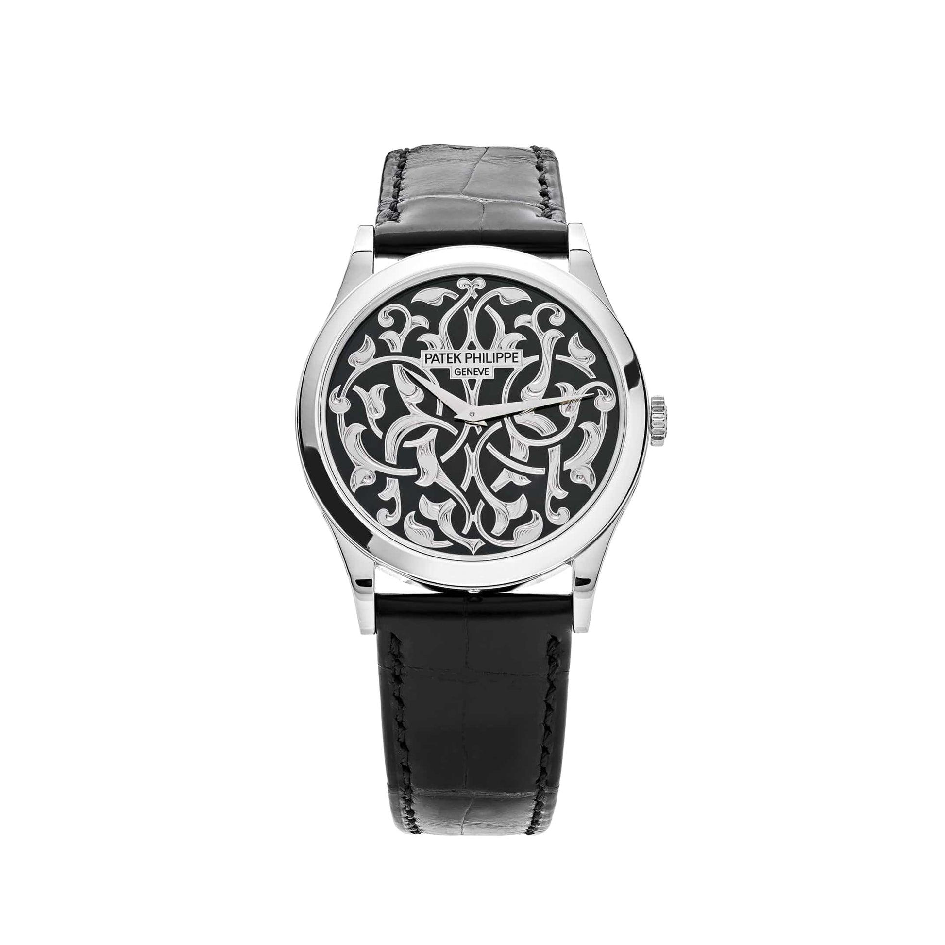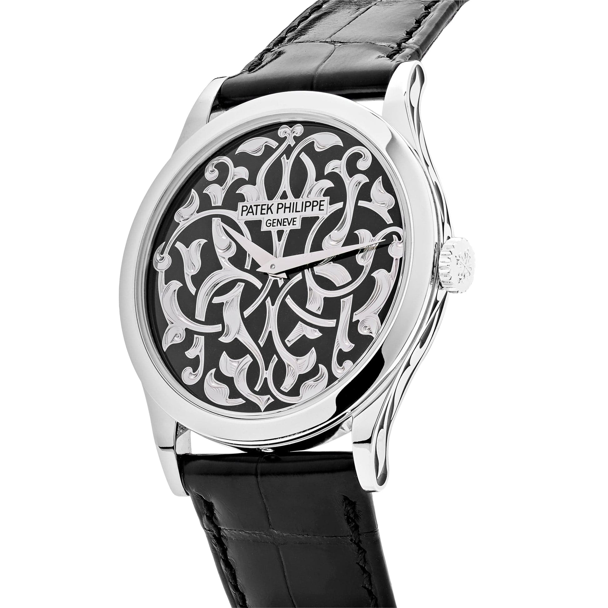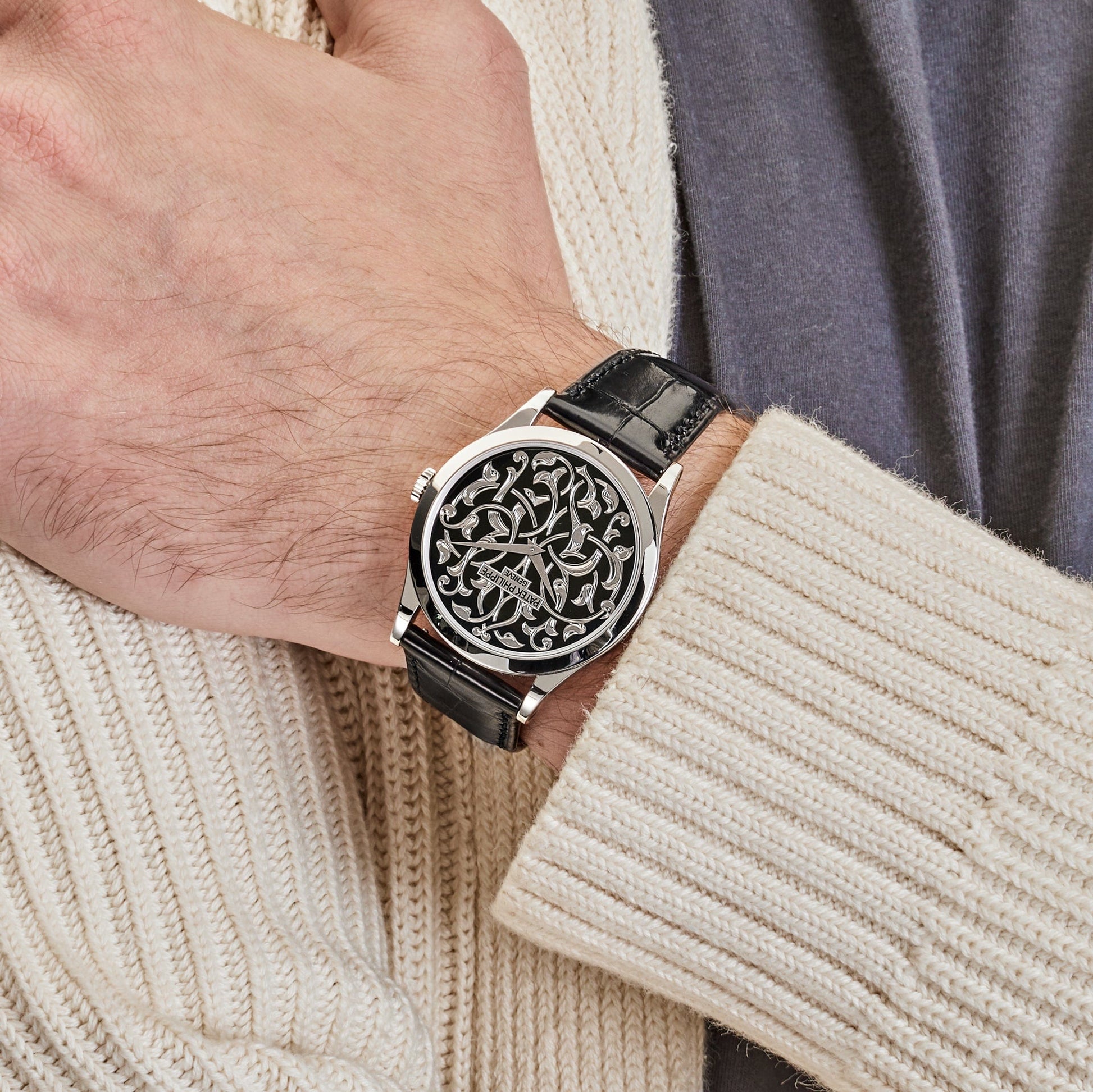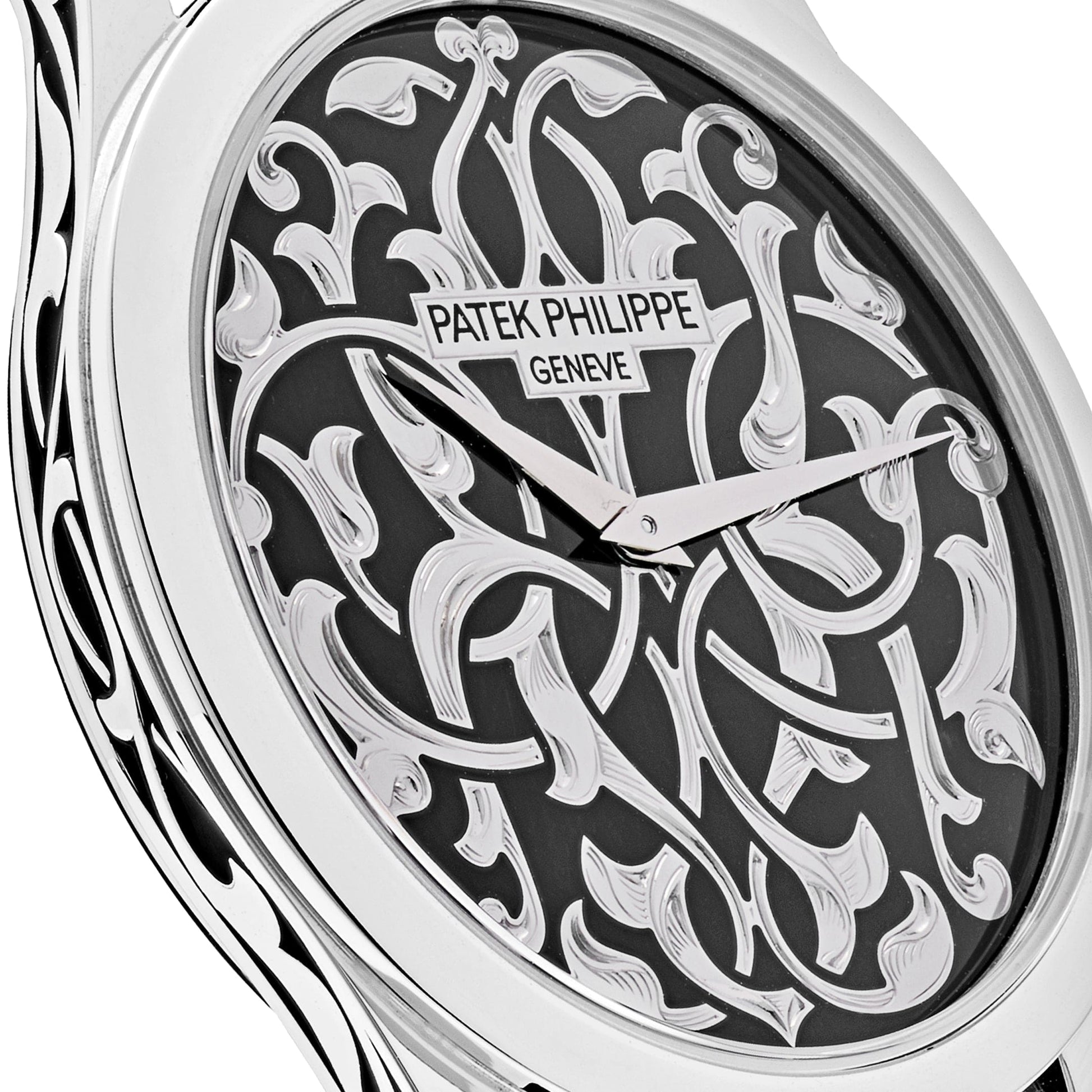 The pièce de résistance of this timepiece is its intricate black enamel dial, featuring a hand-engraved floral motif. This meticulous craftsmanship creates a mesmerizing interplay of depth and texture, exemplifying Patek Philippe’s mastery in traditional métiers d’art. White gold-applied hour markers and dauphine-style hands ensure a sleek and legible display, while maintaining the focus on the dial's artistic beauty.