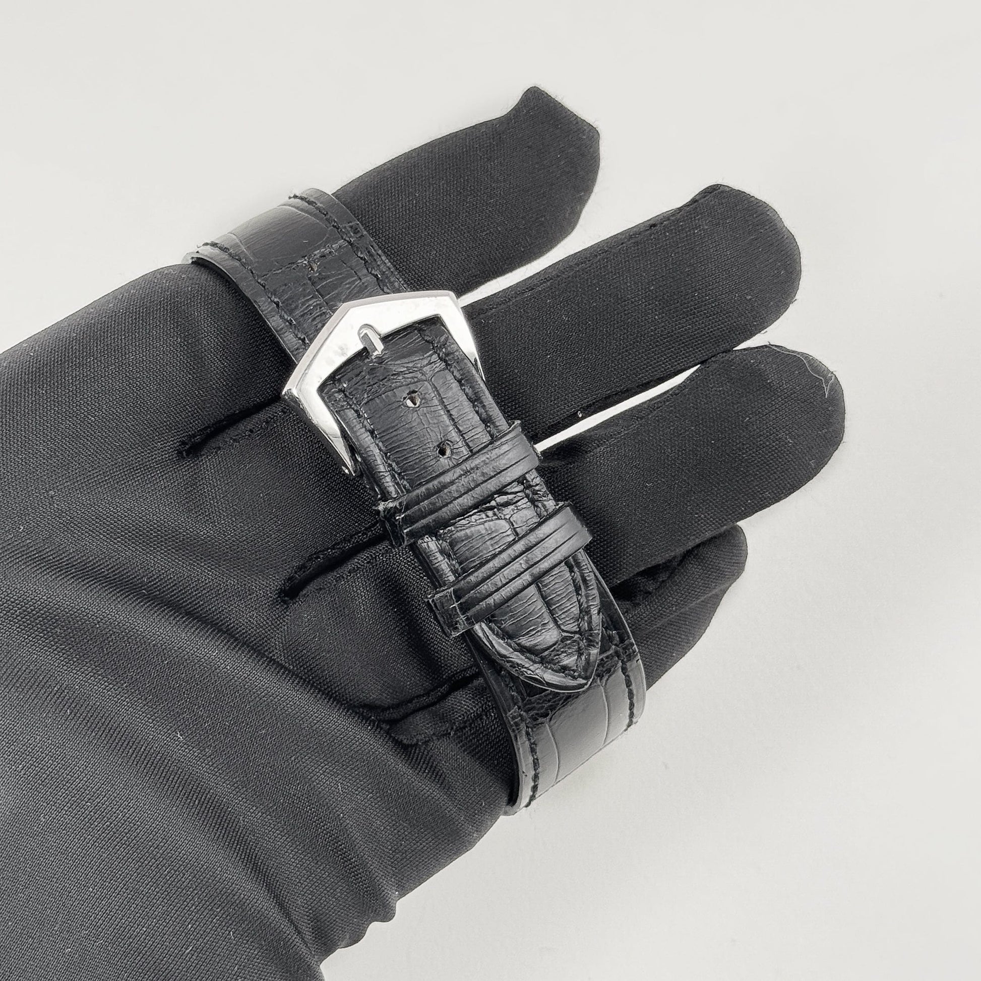 The Patek Philippe Calatrava 5196P-001 is a masterclass in understated elegance, housed in a 37mm platinum case that embodies the timeless purity of the Calatrava line. Its silver dial, finished in a subtle sunburst pattern, is complemented by applied Breguet numerals—an exquisite touch exclusive to the platinum variant of this reference. The sleek, slim profile and absence of a date window preserve the dial’s perfect symmetry, reinforcing Patek Philippe’s dedication to refined simplicity.